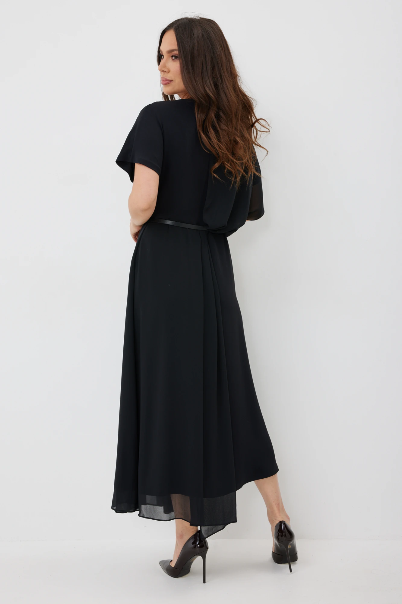 Элегантное платье свободного силуэта. Выполнено из основной красивой плательной ткани в дополнении с легким струящимся шифоном в цвет основной ткани. Платье отрезное по талии. Горловина с V-образным вырезом. Рукав цельнокроеный с напуском. В боковом шве застежка на потайную молнию. В комплекте кожаный пояс с красивой пряжкой. Длина платья 128/138 см.