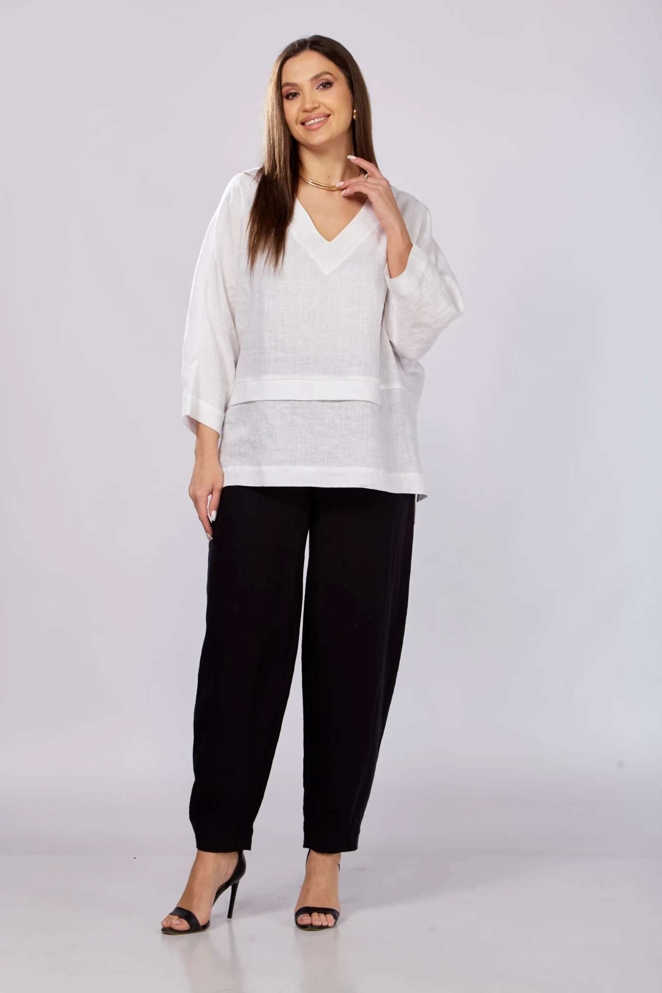 Блузка с цельновыкроенным рукавом.По переду выполнен подрез с декоративной деталью.Спинка со средним швом . На боковых швах разрез. Низ разноуровневый.