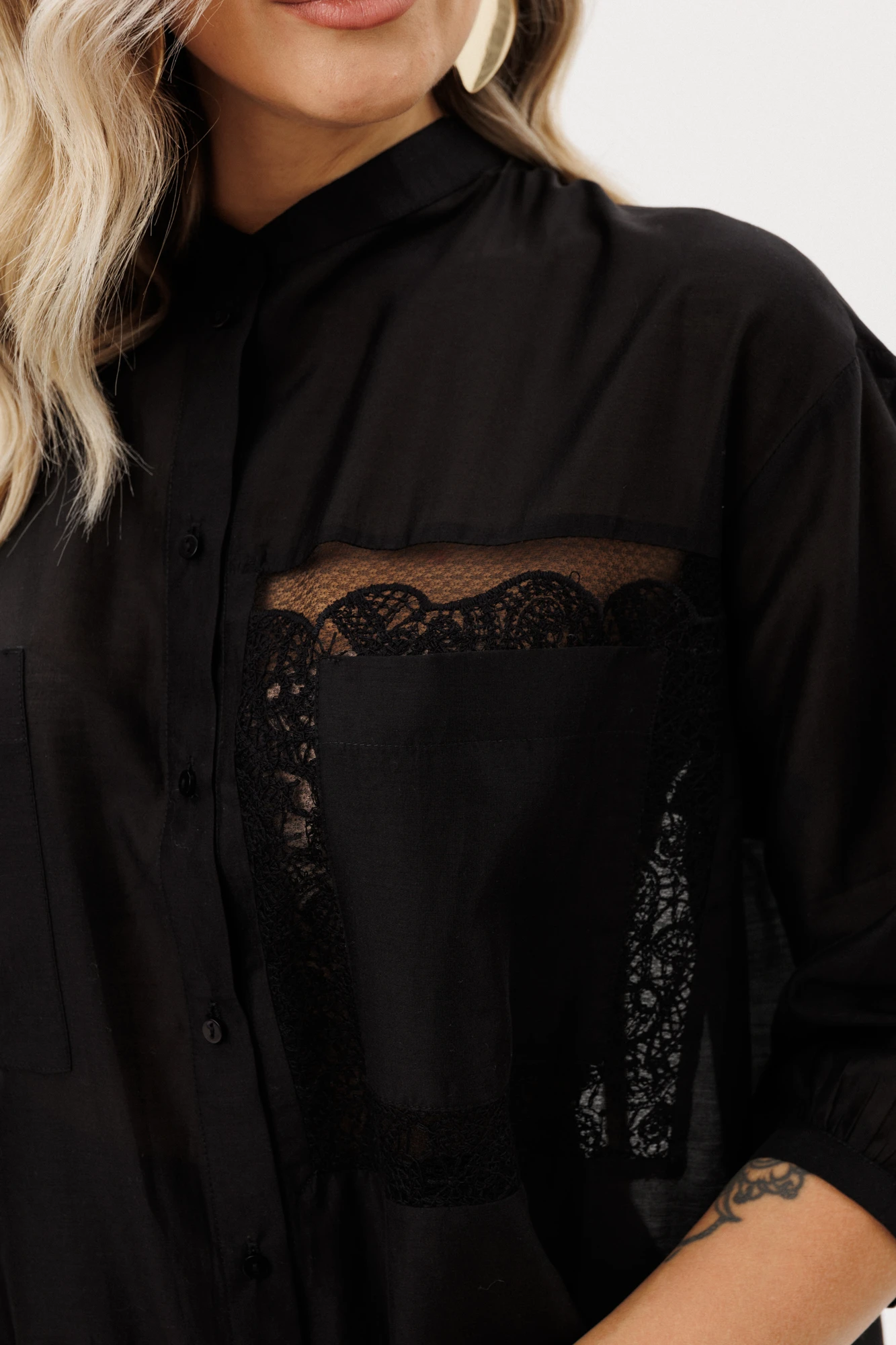 Блуза свободного кроя со спущенным плечом, двумя накладными карманами на полочке. Карман на левой полочке настрочен на декоративную кружевную вставку. Рукав 3/4 с узкими манжетами . Воротник -стойка.