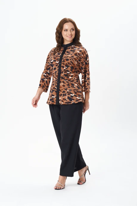 Стильная нарядная женская блузка отрезная по линии талии по переду и по спинке и воротником стойкой. По переду планка на застежку петли пуговицы. Линия плеча, спущенная. Спинка изделия разрезная с таллиевыми вытачками.