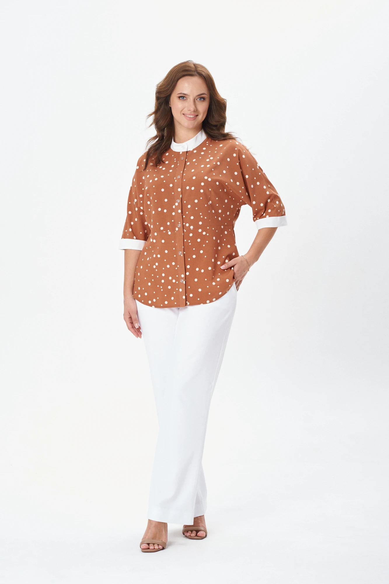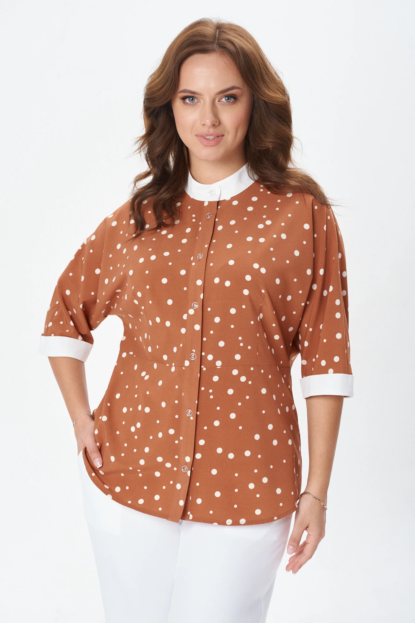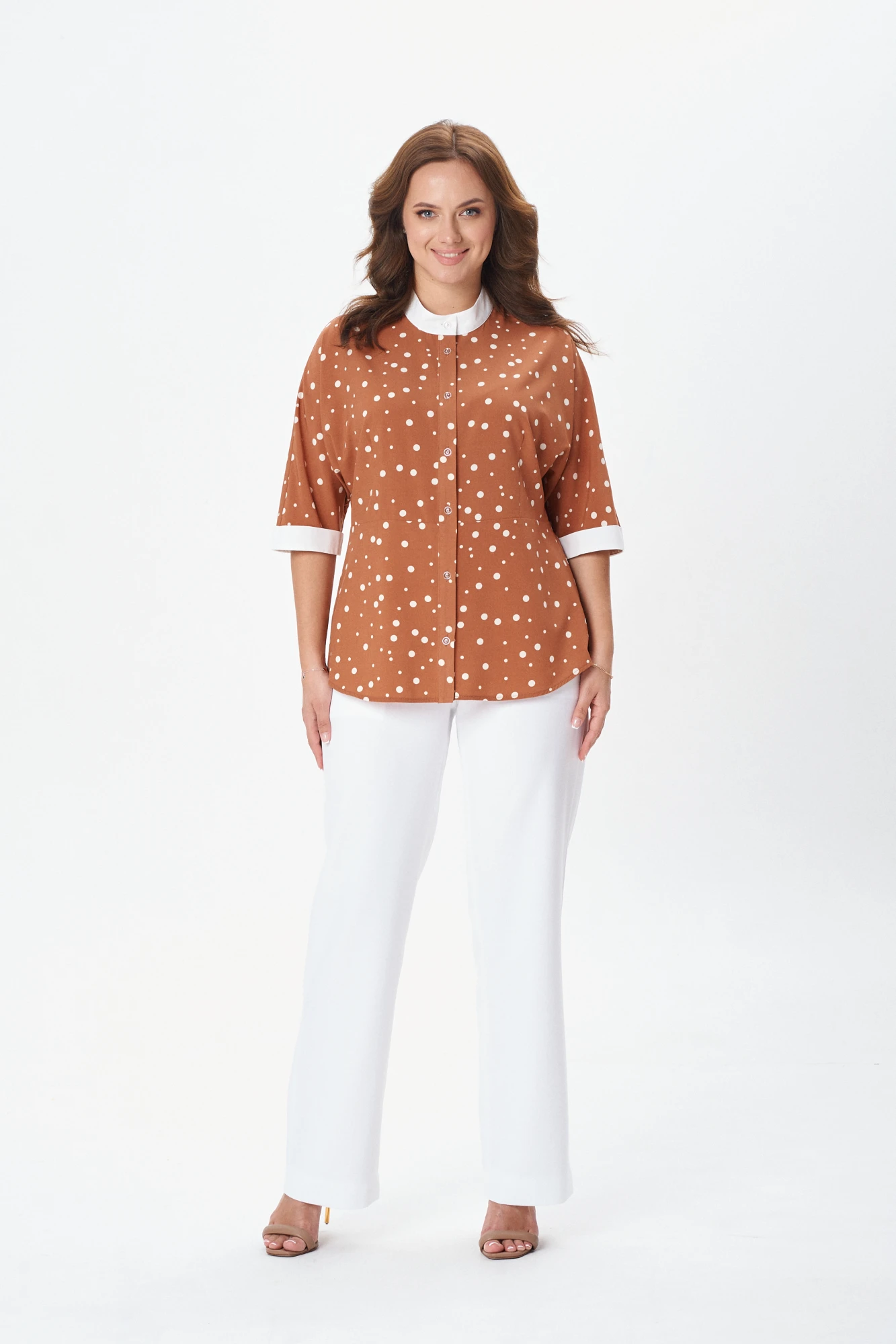 Стильная нарядная женская блузка отрезная по линии талии по переду и по спинке и воротником стойкой. По переду планка на застежку петли пуговицы. Рукав цельнокроеный. По низу рукава притачная манжета. Спинка изделия разрезная с таллиевыми вытачками.