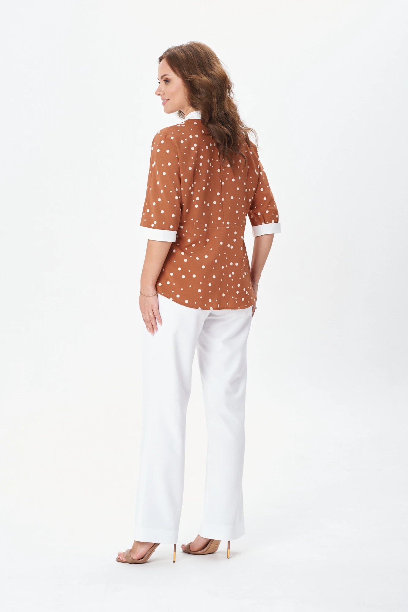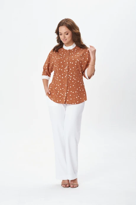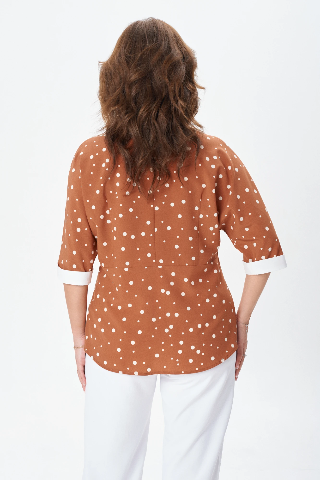 Стильная нарядная женская блузка отрезная по линии талии по переду и по спинке и воротником стойкой. По переду планка на застежку петли пуговицы. Рукав цельнокроеный. По низу рукава притачная манжета. Спинка изделия разрезная с таллиевыми вытачками.