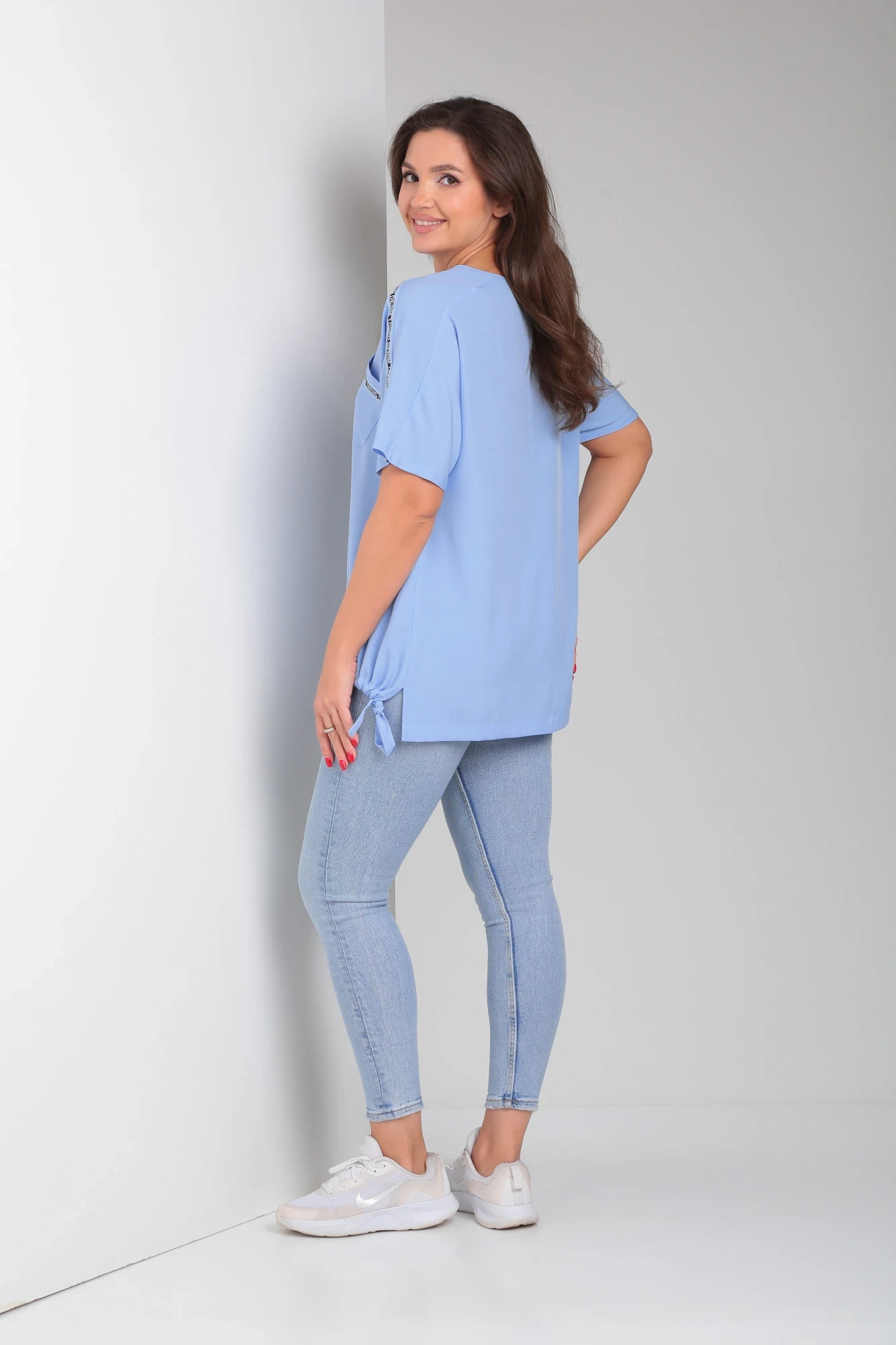Современная женская блузка свободного силуэт с цельнокроеным рукавом и кокеткой полочки и спинки. По переду блузы накладной карман. Понизу полочка переда стянута шнуром из основной ткани. По боковым швам разрезы. Горловина окантована, округлой формы. Спинка блузы прямая стачная. По плечевым швам и на кармане настрочена отделочная лента.