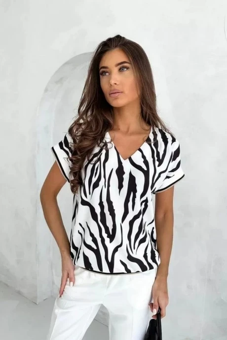 Основные особенности этой классической блузки для женщин: короткий рукав с манжетой со спущенной линией плеча, V-образная горловина , зрительно вытягивает шею, резинка по низу блузки. Свободный крой способствует хорошей посадке и подходит и стройным и полным девушкам.