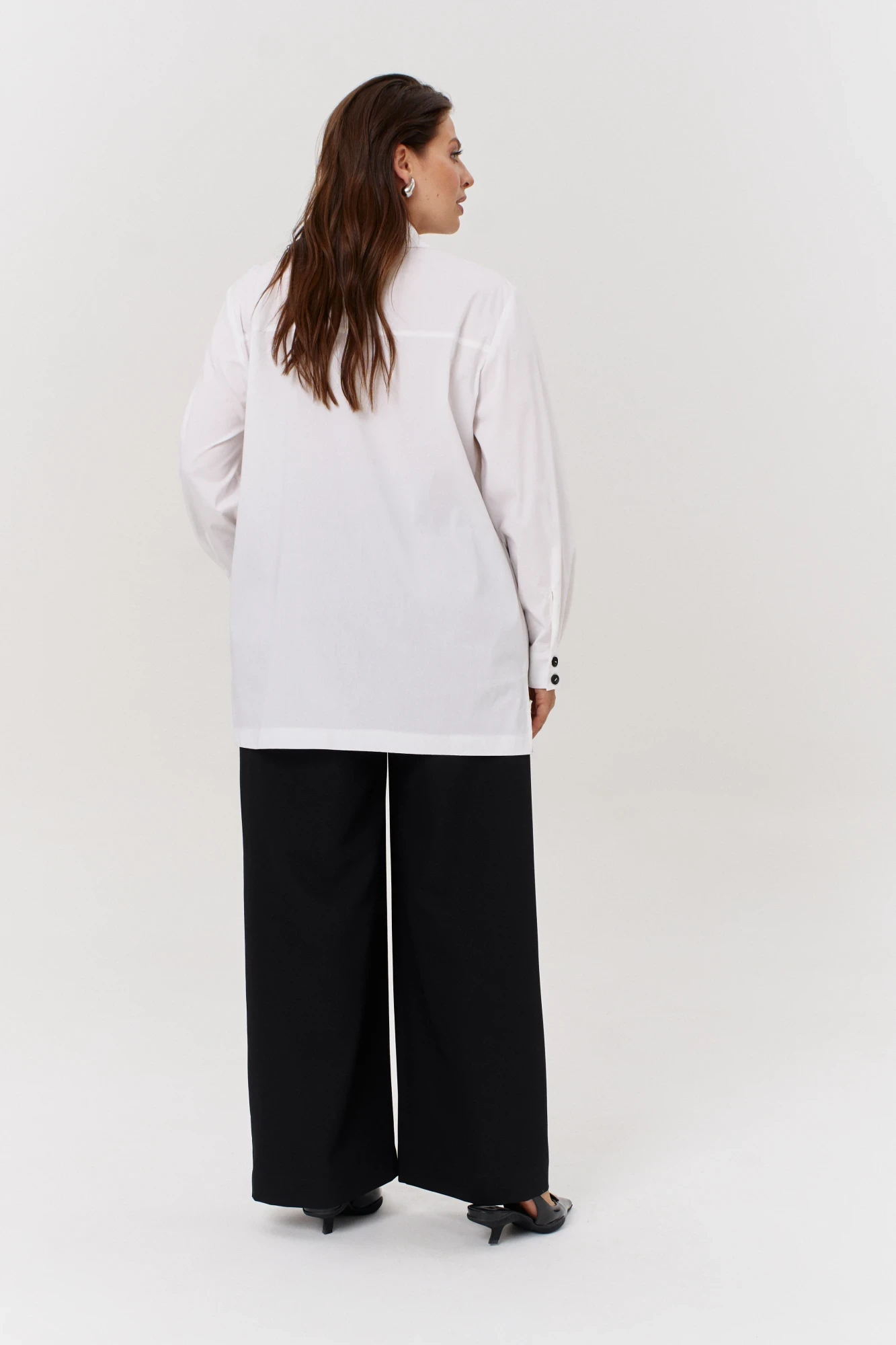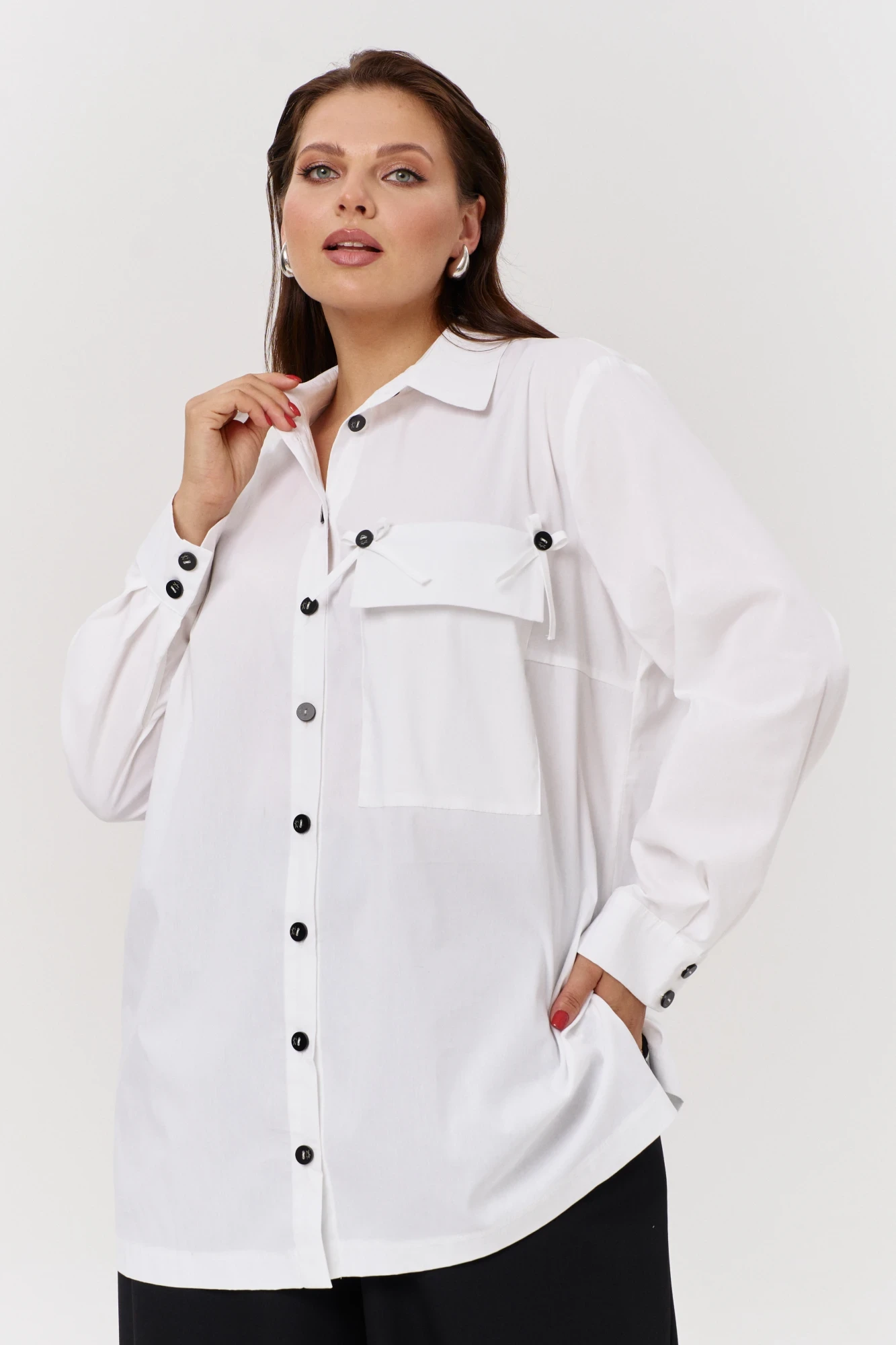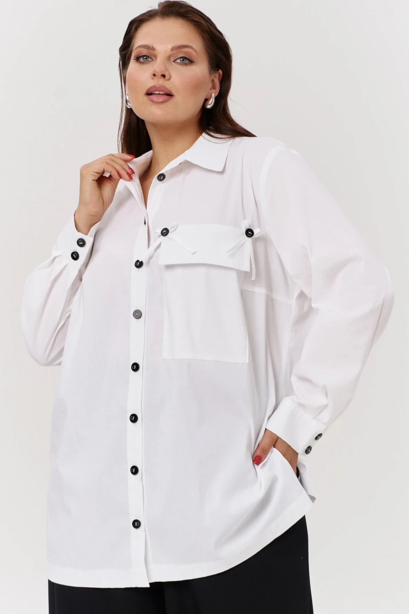 Блузка женская оверсайз типа «рубашка»– это универсальный предмет гардероба любой женщины. Блузка свободного силуэта. Воротник рубашечный отложной на стойке. Рукав втачной, одношовный, внизу на манжете, с застежкой на петлю-пуговицу. Внизу по боковым швам обработаны разрезы. Полочка с застежкой на петли-пуговицы, с накладным карманом. Оригинальным решением является завязки на кармане и контрастные пуговицы. По спинке – кокетка. Офисная рубашка считается эталоном стиля. Рубашка –это элемент одежды в любое время года и по любому случаю. Ткань не скатывается, держит форму. Благодаря удачным лекалам, рубашка займет любимое место в вашем гардеробе.