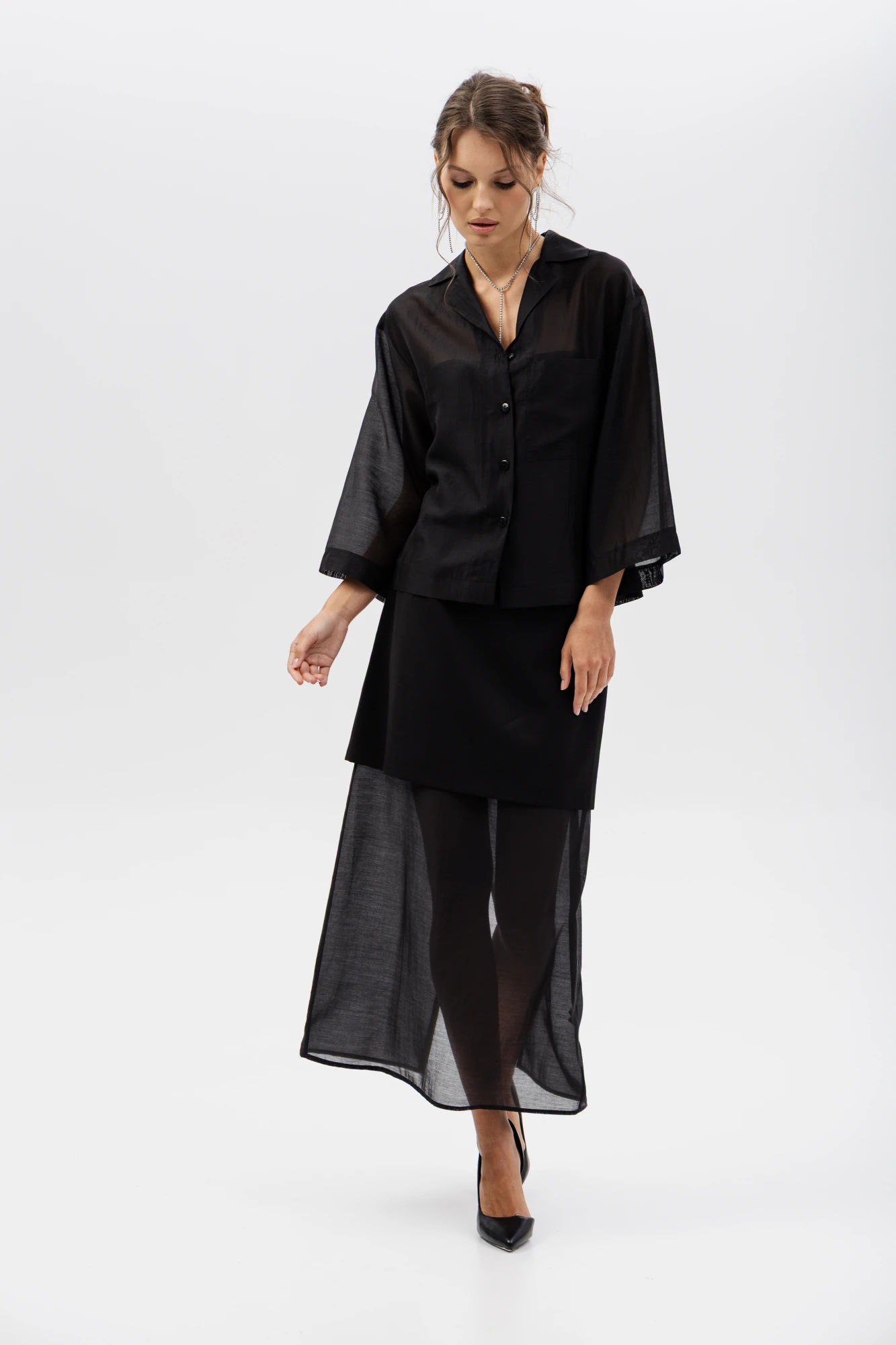 Дизайн: блуза с воротником и застёжкой на пуговицы, дополненная прозрачными рукавами из лёгкой, полупрозрачной ткани, что придаёт образу лёгкость и женственность;