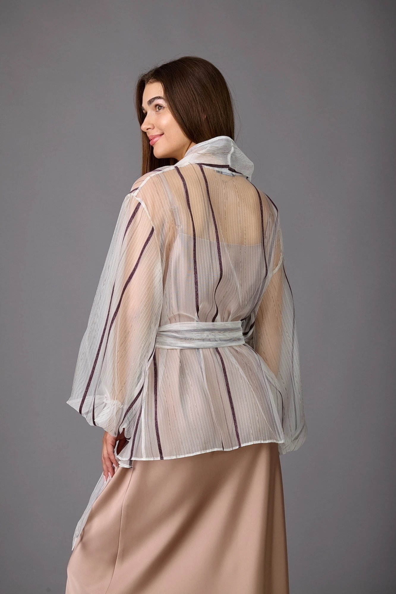 Прозрачная блуза из прозрачной ткани, немного расширена к низу, с планкой по горловине и бортам. Рукава-балон. Завязывается на пояс.