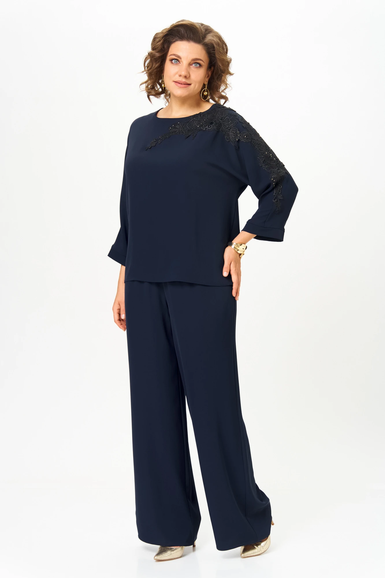 Блузка женская из текстильной ткани с цельнокроеным рукавом. Прямого силуэта. По переду блузки настрочена аппликация. По спинке расположен средний шов. Рукав 3/4, низ рукава с манжетой. Вырез горловины круглый, обработан обтачкой. Блузка застегивается на петлю-пуговицу.