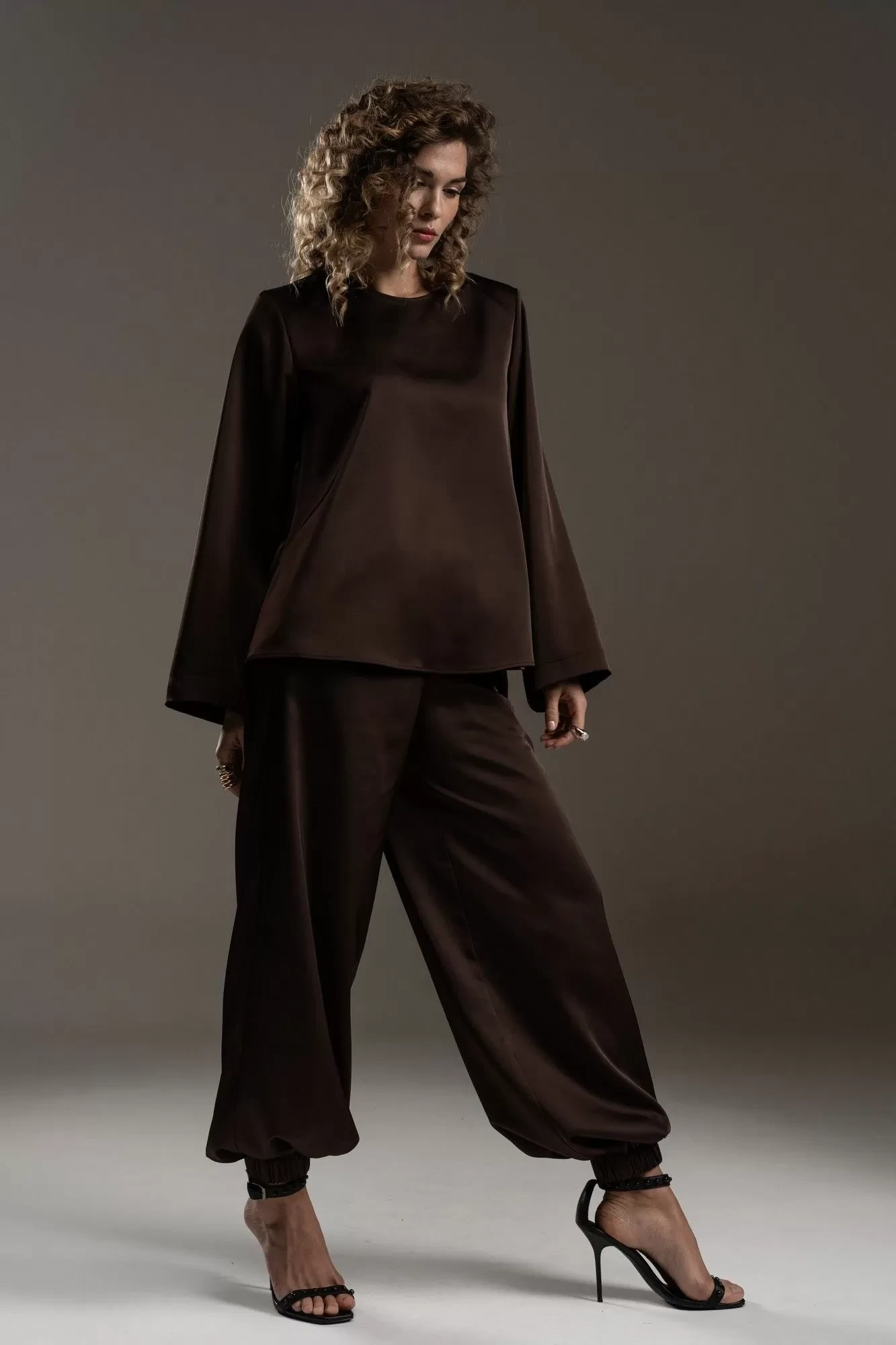 Блузка свободного силуэта, с подплечниками, в глубоком шоколадном оттенке с деликатным сатиновым блеском. Рукав втачной, прямой. По центру спинки обработана застежка на навесную петлю с пуговичкой. Длина по центру спинки 66 см. Длина рукава 61 см. Ширина блузки в области груди, под проймой (в полуобхвате) в 44 размере - 49 см.Ширина по низу изделия (в полуобхвате) в 44 размере 61см. Ширина по низу рукава ( в полуобзвате) в 44 размере 20,5 см.