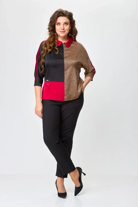 Блузка женская предназначена для повседневной носки, прямого силуэта с цельнокроеным рукавом, без плечевых накладок. Блузка выполнена из комбинирования 3-х цветов ткани. Воротник отложной со стойкой. Перед: полочка прямого силуэта со средним швом, в верхней части которого обработан разрез 10 см. Правая полочка с горизонтальным подрезом, нижняя часть из ткани красного цвета, а верхняя из черного. Левая полочка из ткани расцветки леопард. По плечу отрезная деталь из отделочной ткани красного цвета, переходящая на спинку шириной 5 см, от горловины до низа рукава. Спинка: резная, по центру притачивается планка шириной 5 см из ткани красного цвета, левая часть спинки из черной ткани, а правая из ткани расцветки леопард. Низ рукава обработан манжетой на одну петлю-пуговицу. Длина изделия в 50р-63 см в зависимости от размера. Деликатная стирка при 30 градусах!