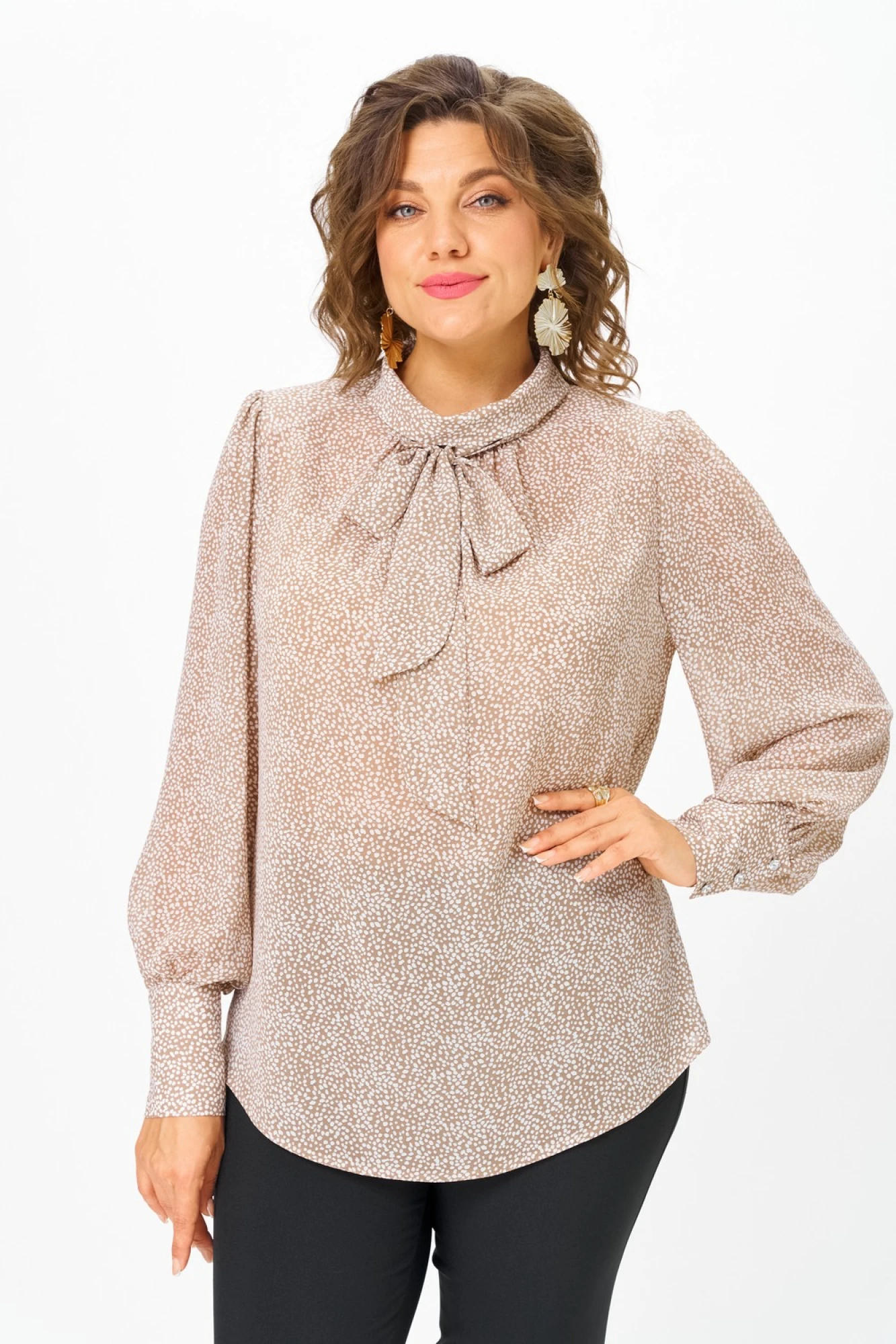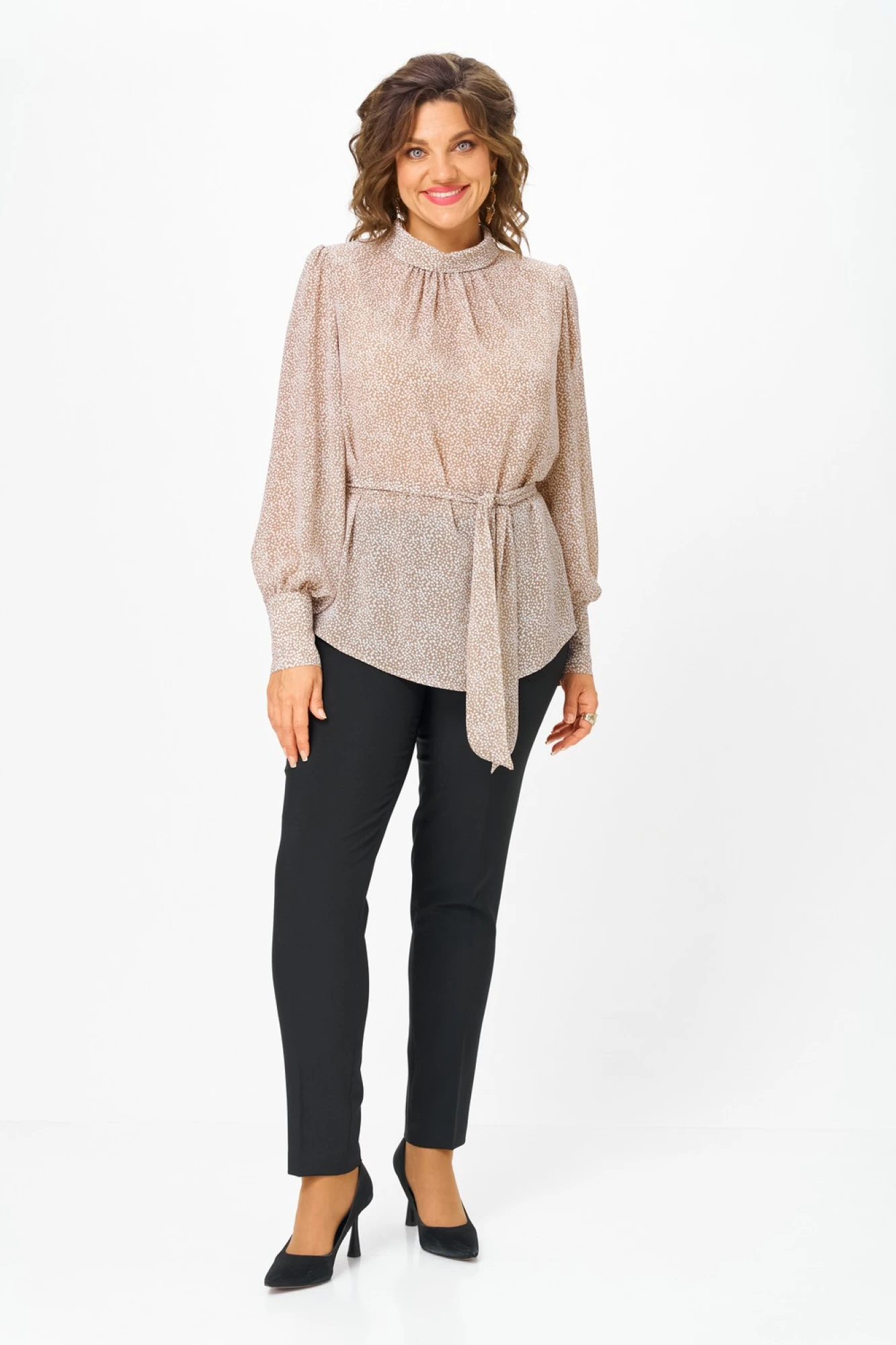 Блузка женская свободного силуэта, с втачным рукавом. Горловина переда с декоративной сборкой и воротником - хомут. Отделкой служит съемный бант. Спинка со средним швом и застежкой по воротнику на две воздушные петли и пуговицы. Рукав длинный со сборкой по окату и низу рукава, на широкой манжете с застежкой на петли и пуговицы.