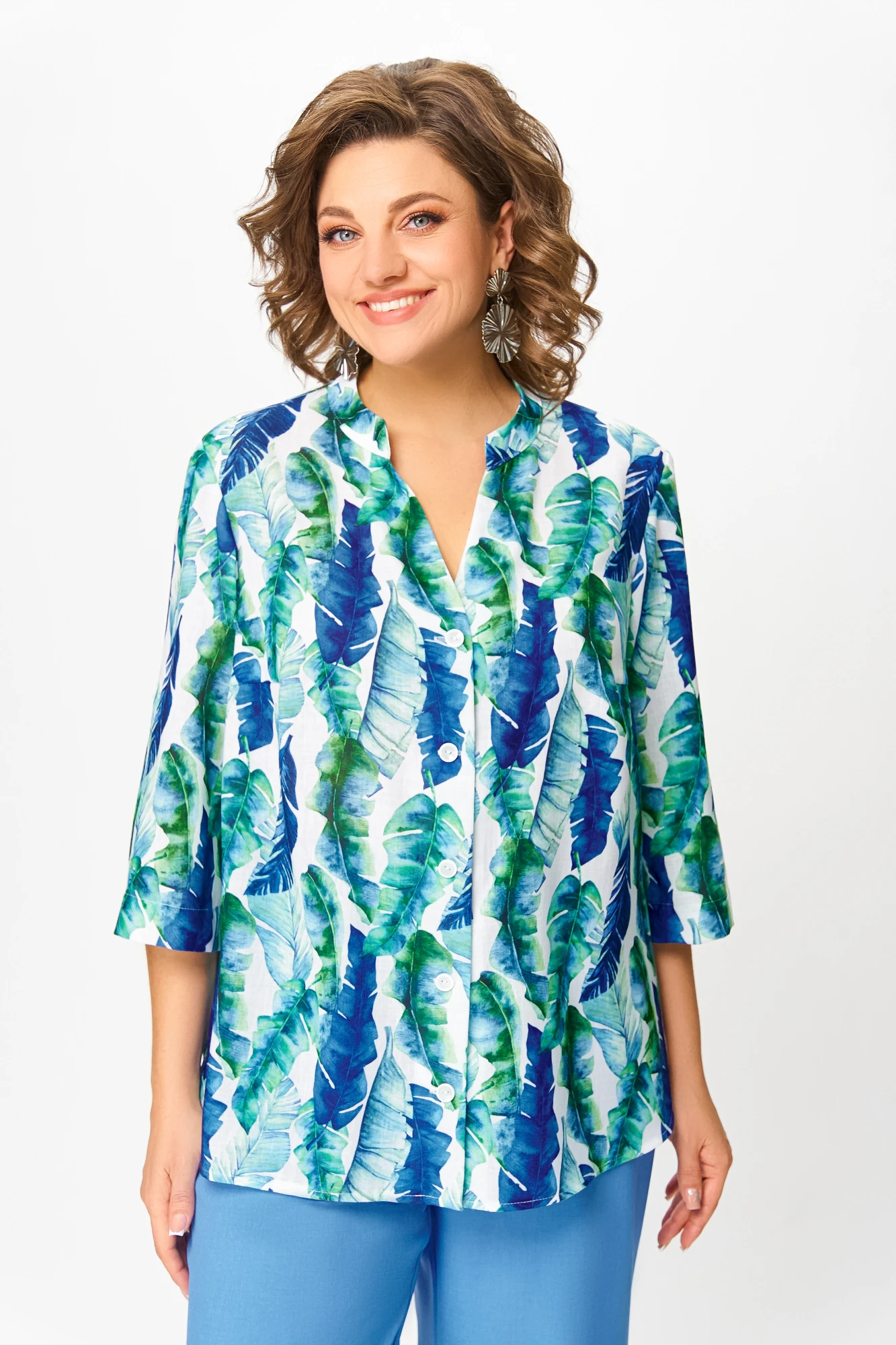 Блузка Swallow 852.2 Молочный, принт «сине-зелёные_листья»