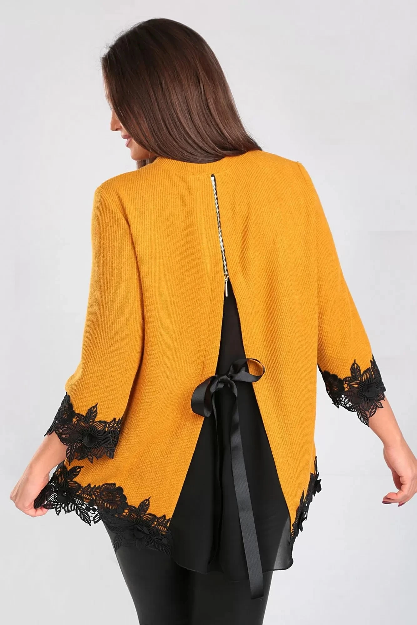 Удобная и практичная, к низу расширенная с шифоновой вставкой на спине, украшенная кружевом по низу изделия и рукавам. Ткань тянется и подходит для любого времени года. Низ изделия по спинке длиннее, а по полочке короче и имеет округлую форму. В виде украшения на уровне талии, на спинке, пришита репсовая тесьма, которой можно регулировать ширину изделия, украшая, завязанным бантом.