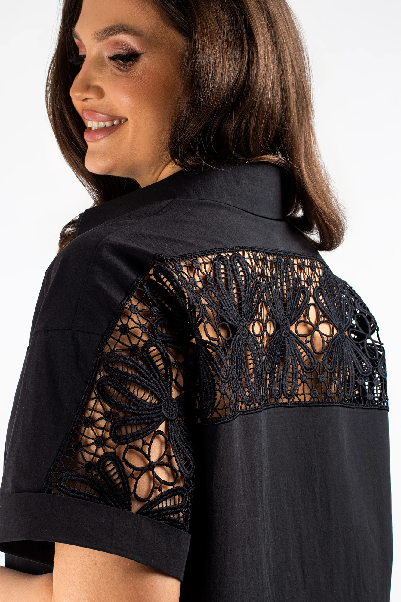 Спинка с отрезной кокеткой и с вставкой из кружева, переходящее на рукав.