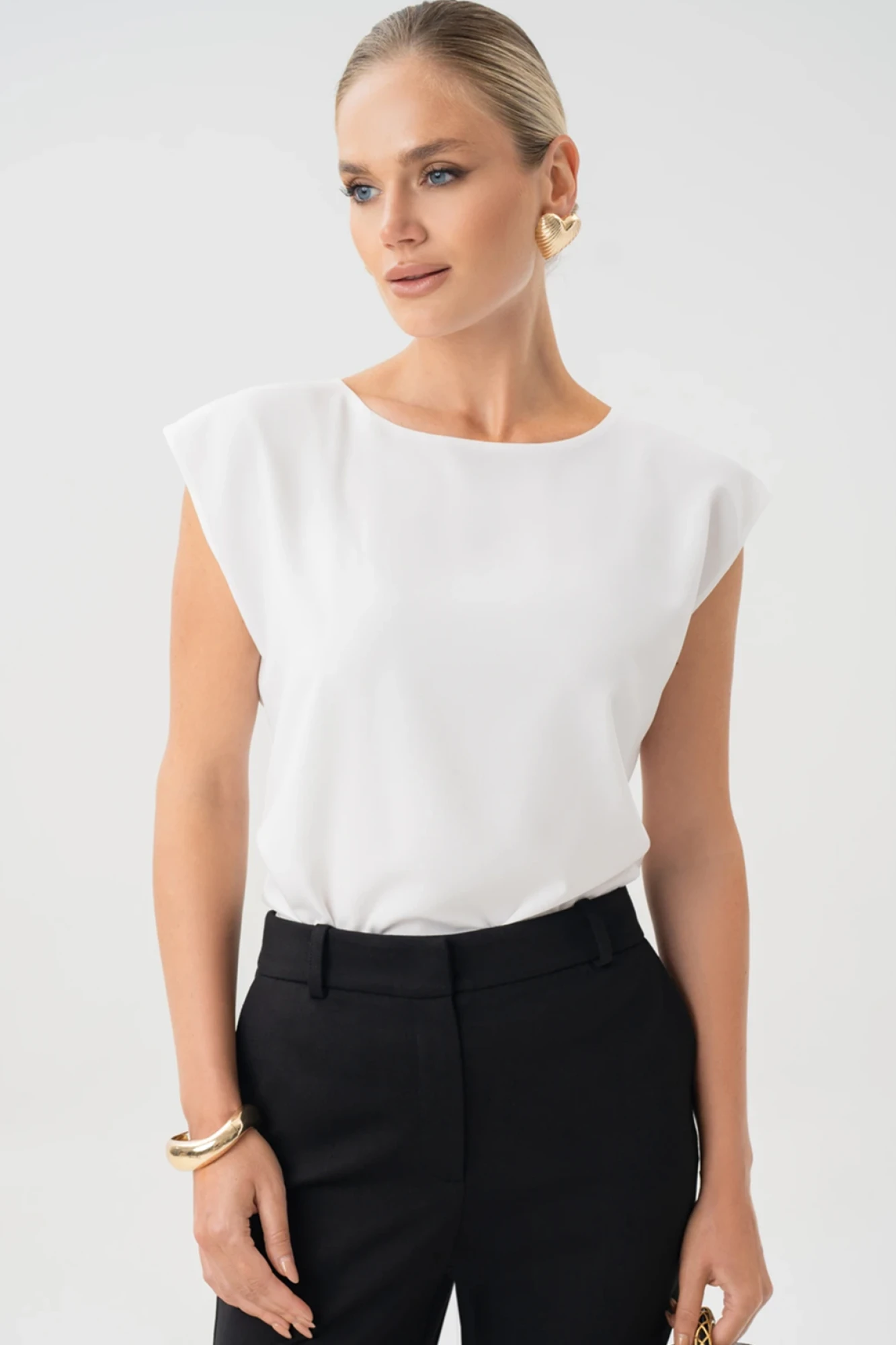46:Длина посередине спинки - 55,0 см (±1,5 см), Длина рукава - 19,0 см (±1,0 см), Ширина на уровне глубины проймы - 50,5 см (±1,0 см), Ширина на уровне линии талии - 52,5 см (±1,0 см), Ширина по низу блузки - 54,0 см (±1,0 см), Ширина рукава - 17,5 (±1,0 см), длина плеча - 10,2 см (±0,5см)
