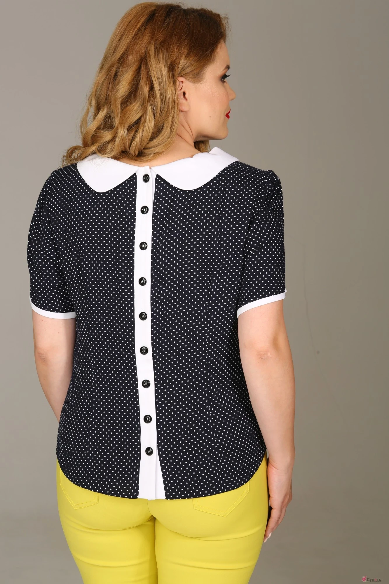 Элегантная женская блуза полуприлегающего силуэта. Горловина круглая оформленна отложным воротником с закругленными концами из контрастной ткани.На спинке планка из контрастной ткани с декоративными пуговицами.Рукава втачные со складками по окату, низ рукава оформлен планкой.