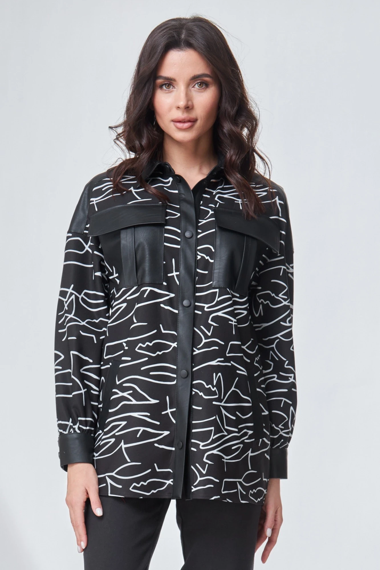Блузка свободного силуэта. Воротник рубашечного типа на притачной стойке. Перед с кокеткой и центральной застежкой на кнопки на притачных планках, нагрудными карманами с клапаном и прорезными карманами с листочкой. По спинке - кокетка. Рукав втачной длинный, со спущенным плечевым швом, на манжете с застежкой на кнопки. Карманы, кокетки, воротник, планки и манжеты блузки выполнены из экокожи. "