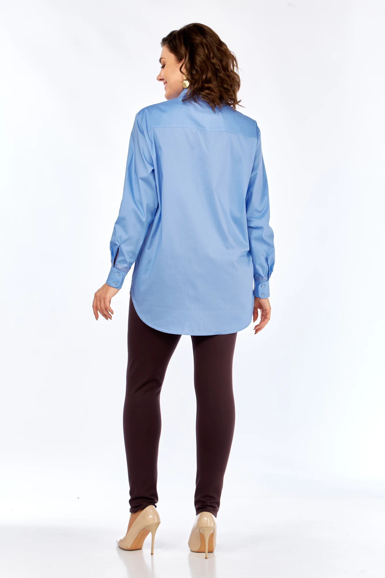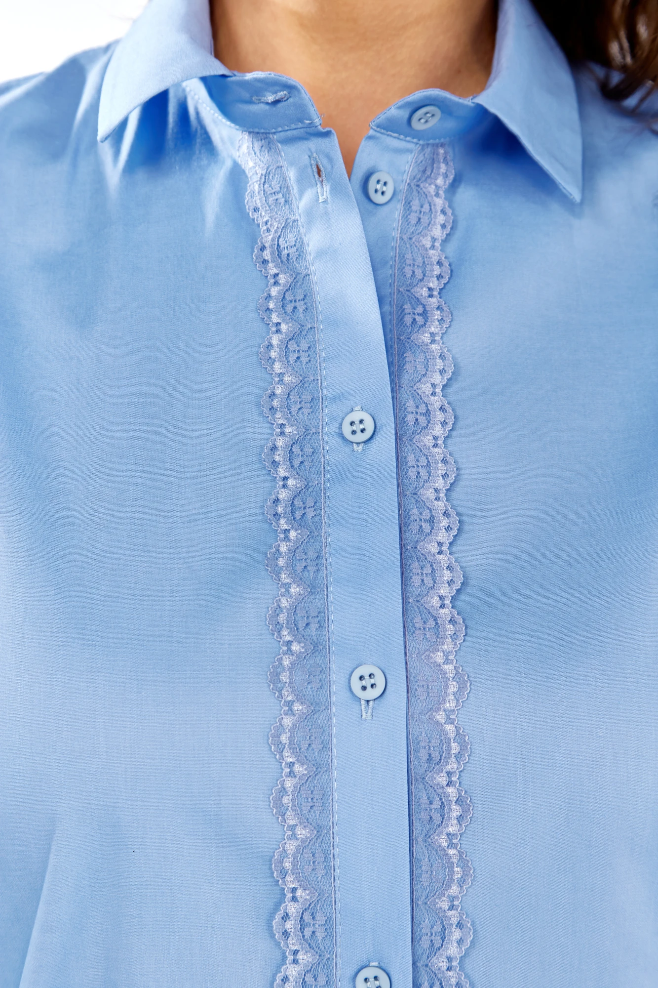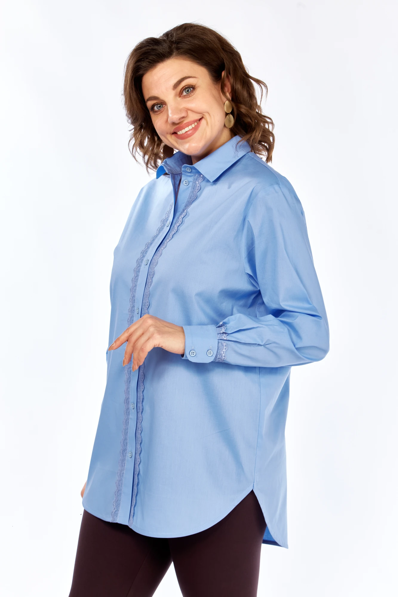 "Рубашка свободного кроя, в стиле оверсайз. Силуэт свободный. На переде от каждой из планок, на сторону изделия настрочено кружево в тон рубашки. Рукав рубашечный с разрезом и складками,заканчивается закругленной манжетой, которая застегивается на 2 петли и пуговицы. От манжеты на изделие настрочено кружево в тон рубашки. Плечо спущенное. Низ закругленный к бокам. Длина по спинке(от точки пересечения шеи и плеча)-83см, длина рукава+манжета-60,5см, длина плеча-17см, длина переда( от точки пересечения шеи и плеча).
