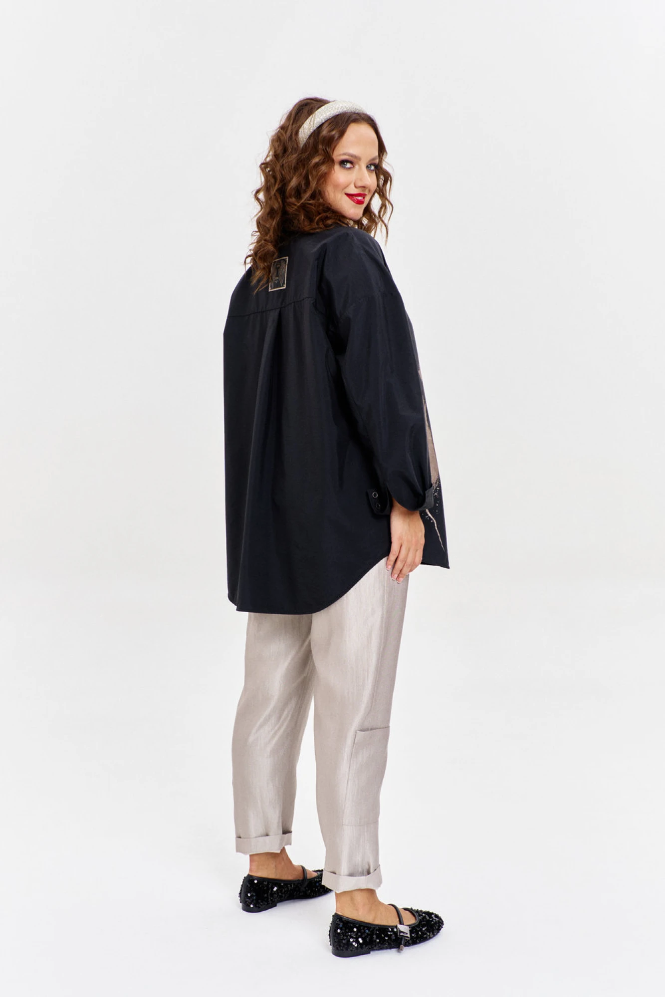 Рубашка свободного силуэта, с застежкой на пуговицы спереди, с длинным рукавом и рубашечным воротником. Спинка с отрезной кокеткой и бантовой складкой. Изделие декорировано авторским принтом и нашивками.