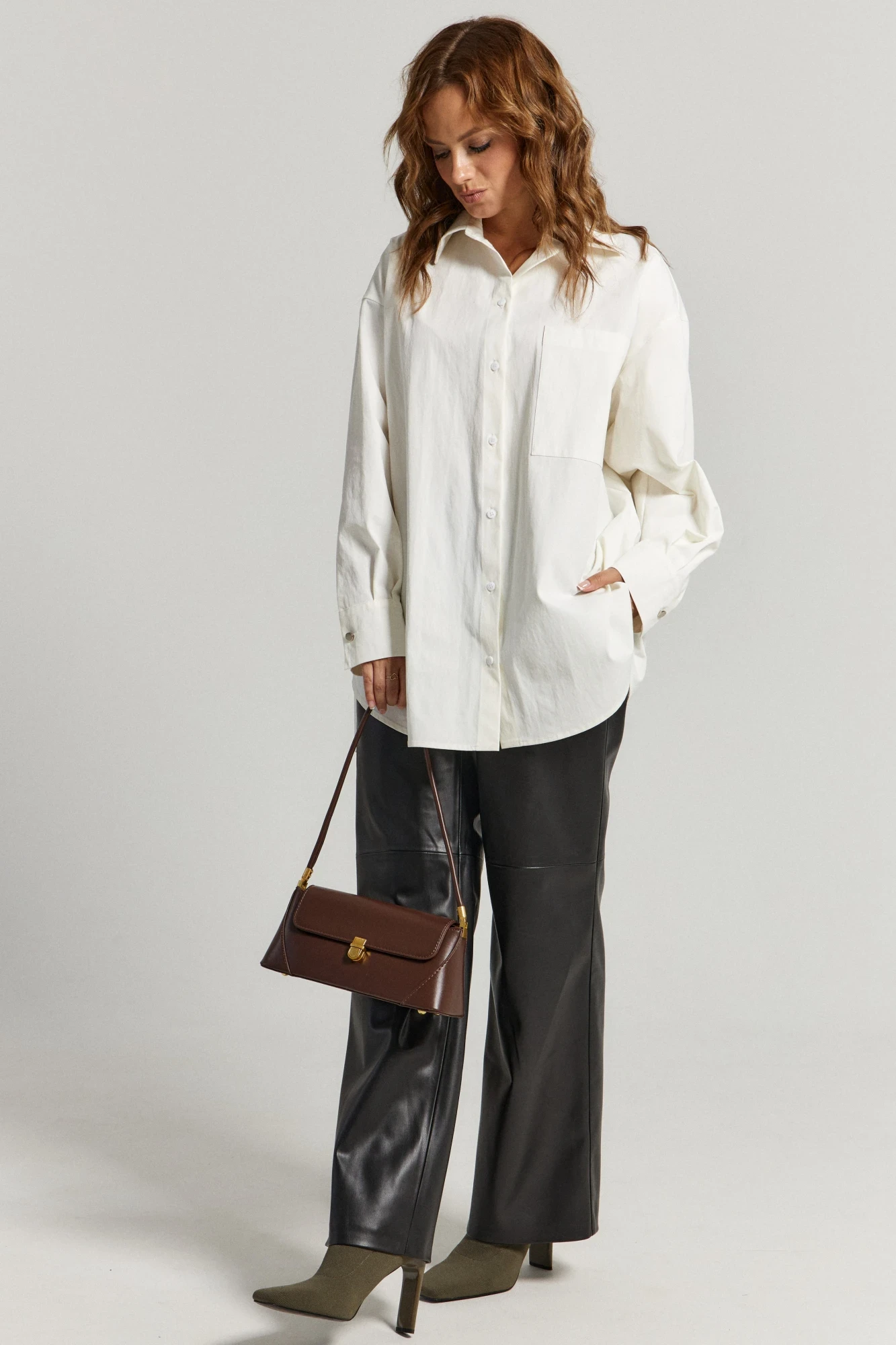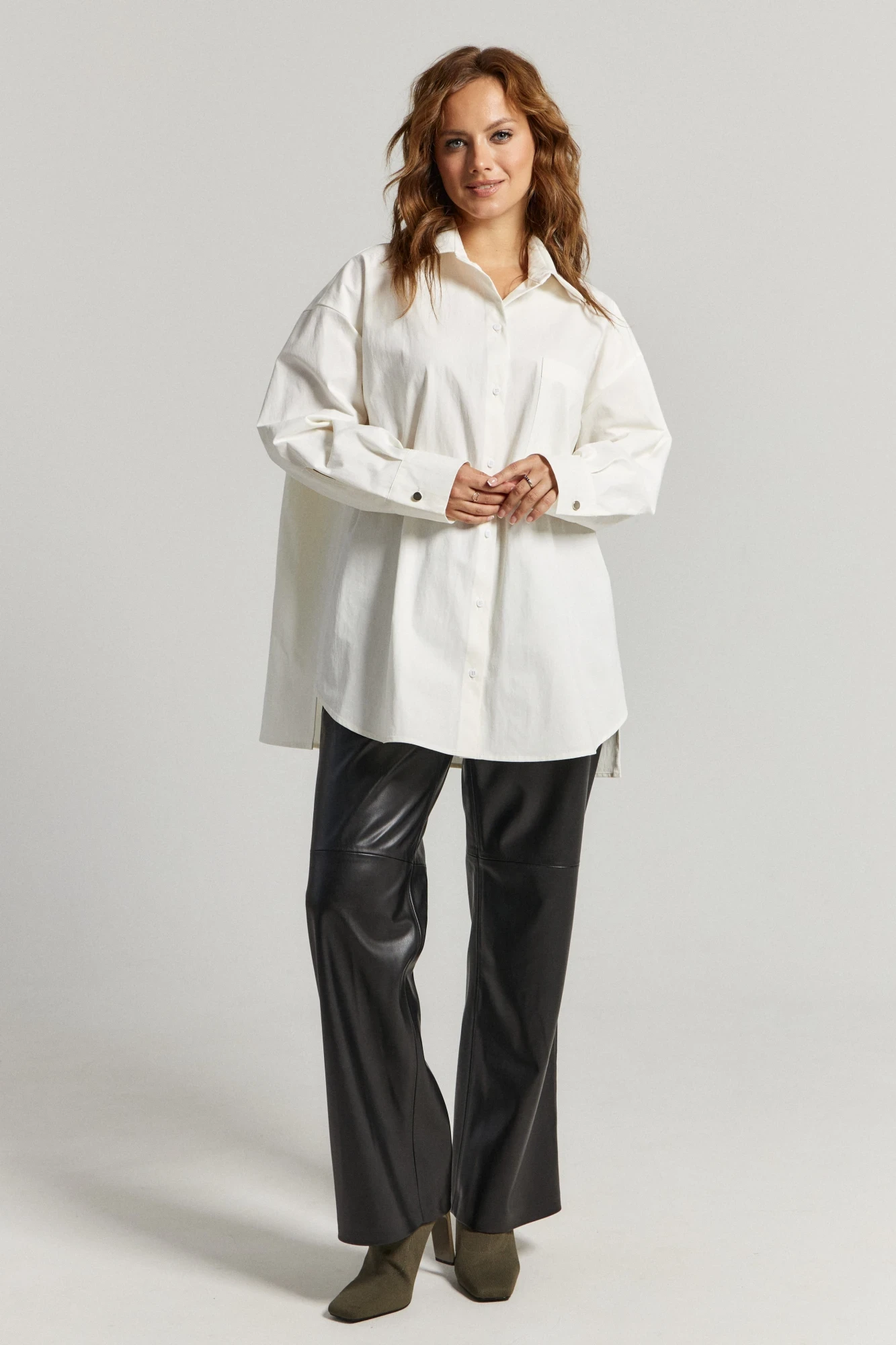 Рубашка выполнена из белой хлопковой ткани. Прямого свободного силуэта. По переду застежка на пуговицы, воротник классический, рукав спущенный на манжете с пуговицей. По переду боковой карман по верху изделия