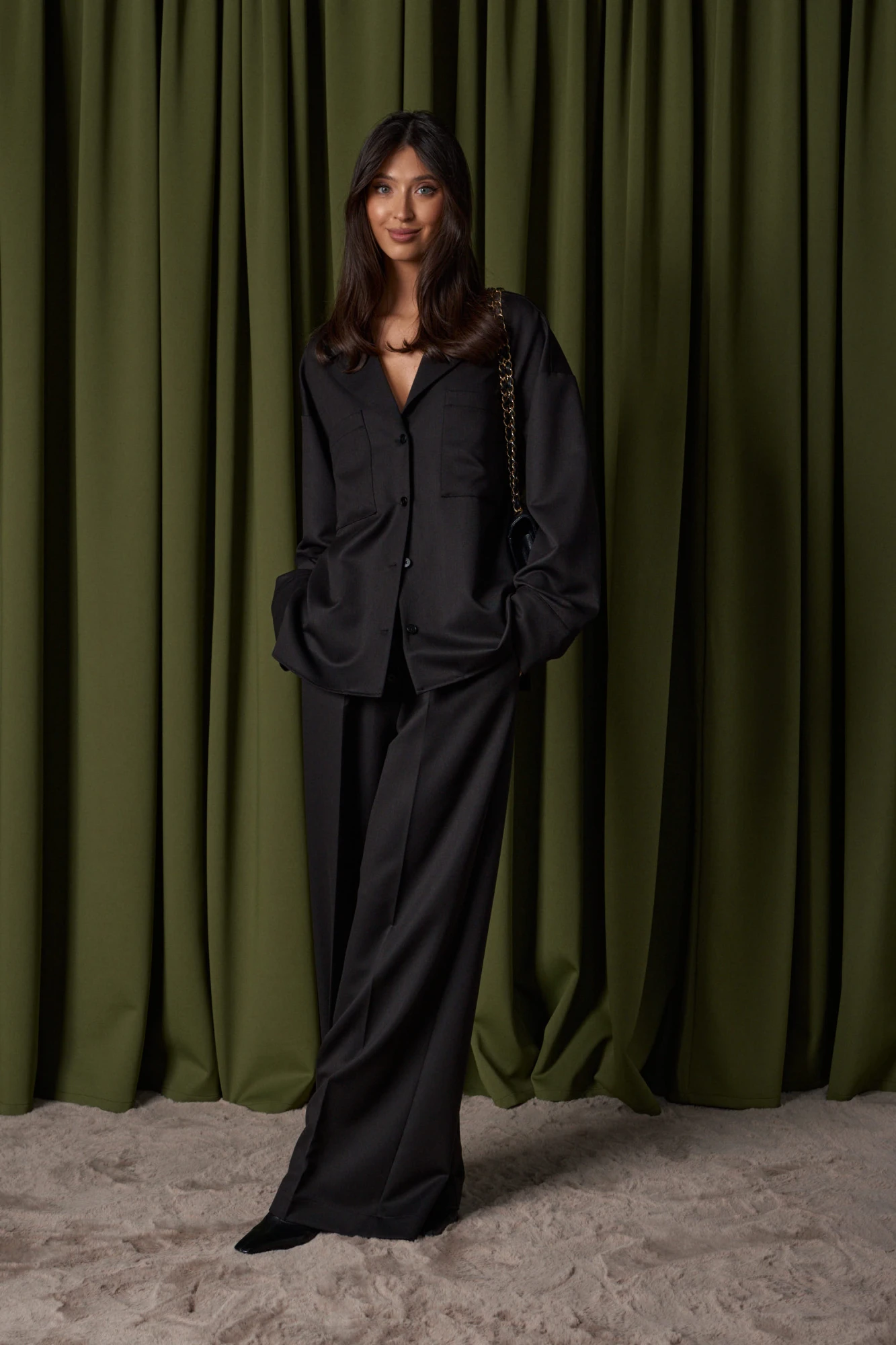 Рубашка свободного кроя. Выполнена из плотной текстильной ткани чёрного цвета. Воротник отложной, пиджачного типа, с лацканами. Рукав втачной, спущенный, с широкой манжетой. По переду на уровне груди накладные карманы. В средних швах рубашки разрезы (19 см). Застёжка центральная - пуговицы. Длина рукава от линии втачивания 55 см. Длина спинки 67 см