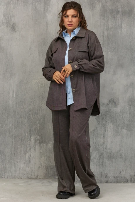 Рубашка свободного кроя выполнена из приятной к телу текстильной костюмной ткани с рисунком, имитирующим трикотажное плетение нитей. Данная модель – это идеальный вариант для на каждый день. Это модель, с которой можно экспериментировать и создавать множество образов. Рубашка выполнена в стиле оверсайз. По линии груди декоративные клапаны, по низу декорированные кромкой материала. Рукав имеет спущенную пройму и по низу обработан манжетой с застёжкой на пуговицу. Полочка имеет функцию застёжки на стильные пуговицы. Спинка немного длиннее полочки. Низ изделия декорирован кромкой из основного материала.