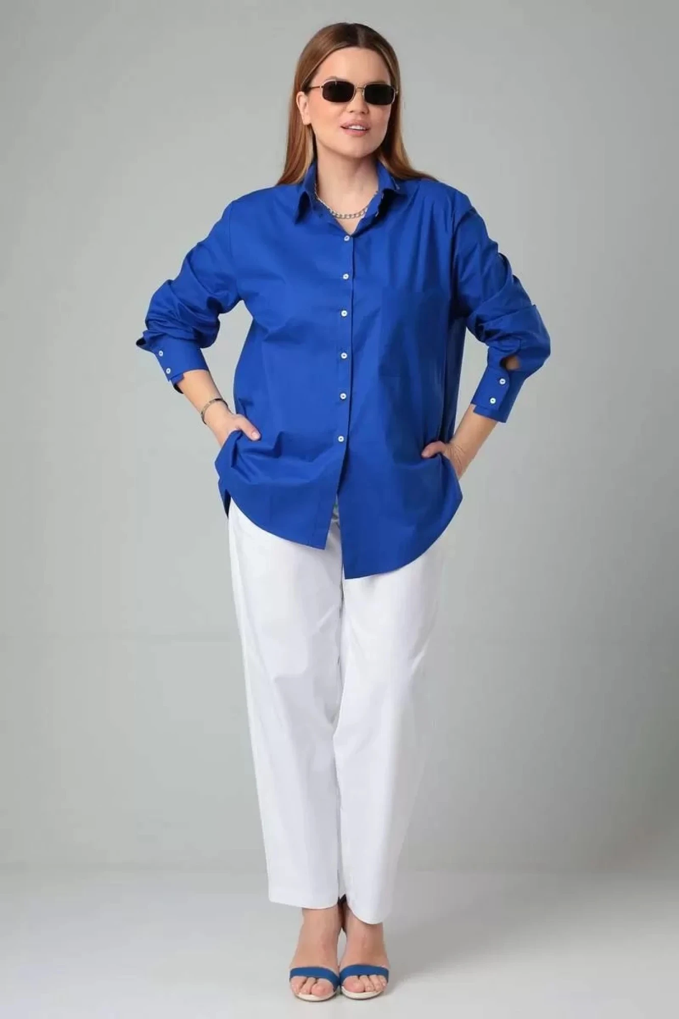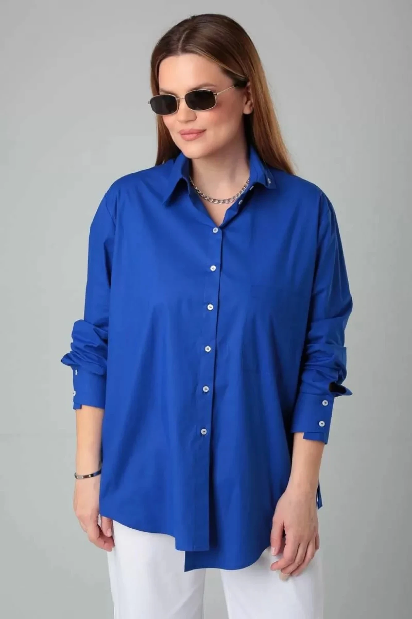 Рубашка прямого силуэта подходит под любые формы и типы фигуры. Правая полочка короче левой, при этом вытягивая силуэт. На левой полочке расположен карман. По спинке имеется кокетка с пришивным декором. Эффектный образ создается за счет необычных деталей и элементов. Асимметричные манжеты и полочка фишка этой рубашки. Ведь любая асимметрия стройнит!