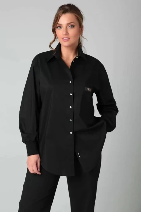 Рубашка прямого силуэта подходит под любые формы и типы фигуры. На левой полочке расположен карман. По спинке имеется кокетка с пришивным декором. Эффектный образ создается за счет необычных деталей и элементов. Трикотажные манжеты и белые пуговицы фишка этой рубашки. Чёрная рубашка– это не только стильно, но и эффектно, а ещё и удобно. Прямой силуэт, который стройнит и чёрный цвет сочетается со всей палитрой одинаково классно. Добавляем эту рубашку к любому “низу” образ готов. Модель OverSize. Длина по переду 79 см. Длина по спинке от воротника 79 см.