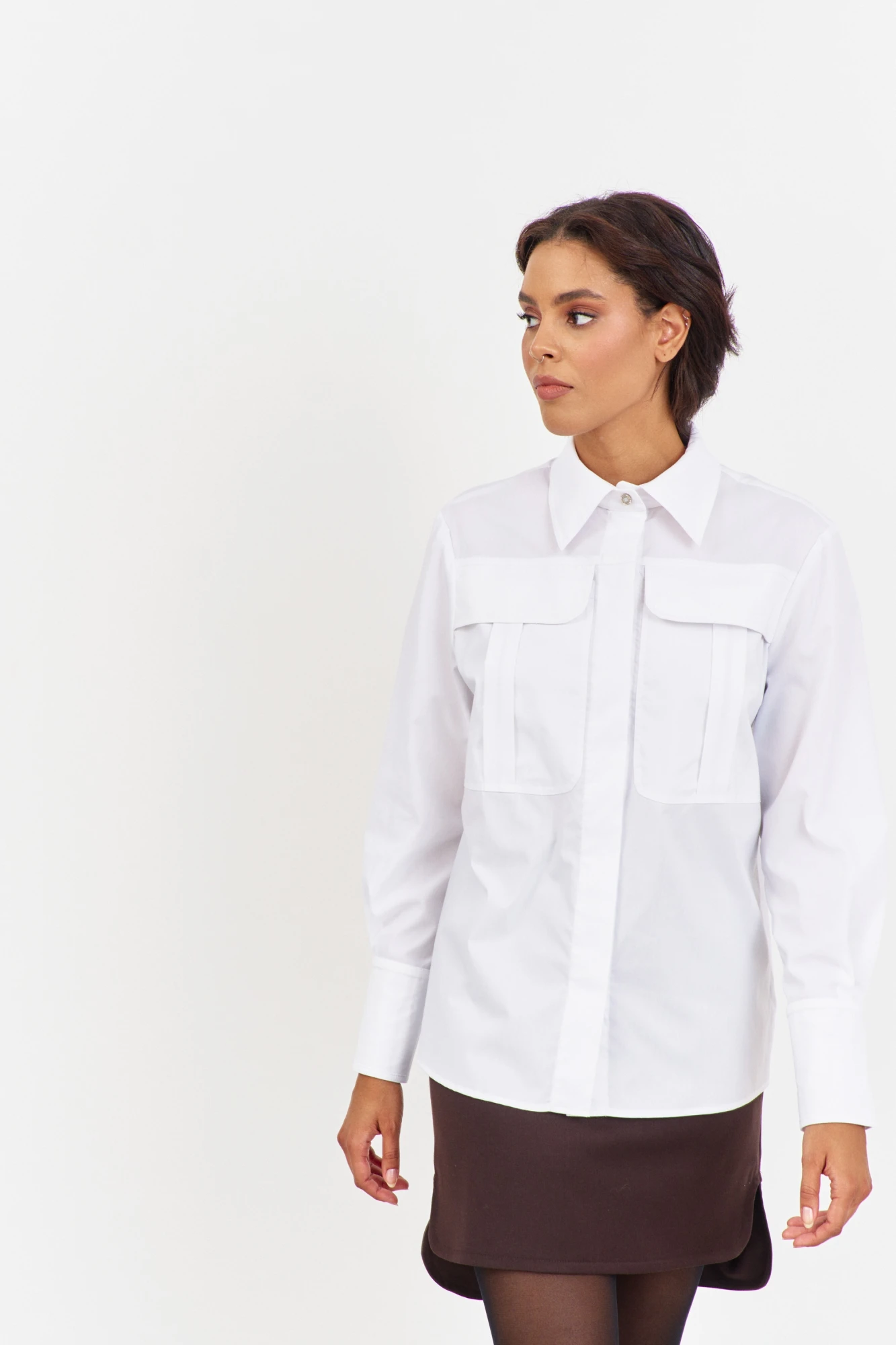 Рубашка приталенного кроя с декоративными карманами по переду. Характеристики: выполнена из блузочной ткани в белом цвете, по переду обработаны декоративные карманы, центральная застежка на петли и пуговицы, по низу рукавов манжеты с декоративными углами.