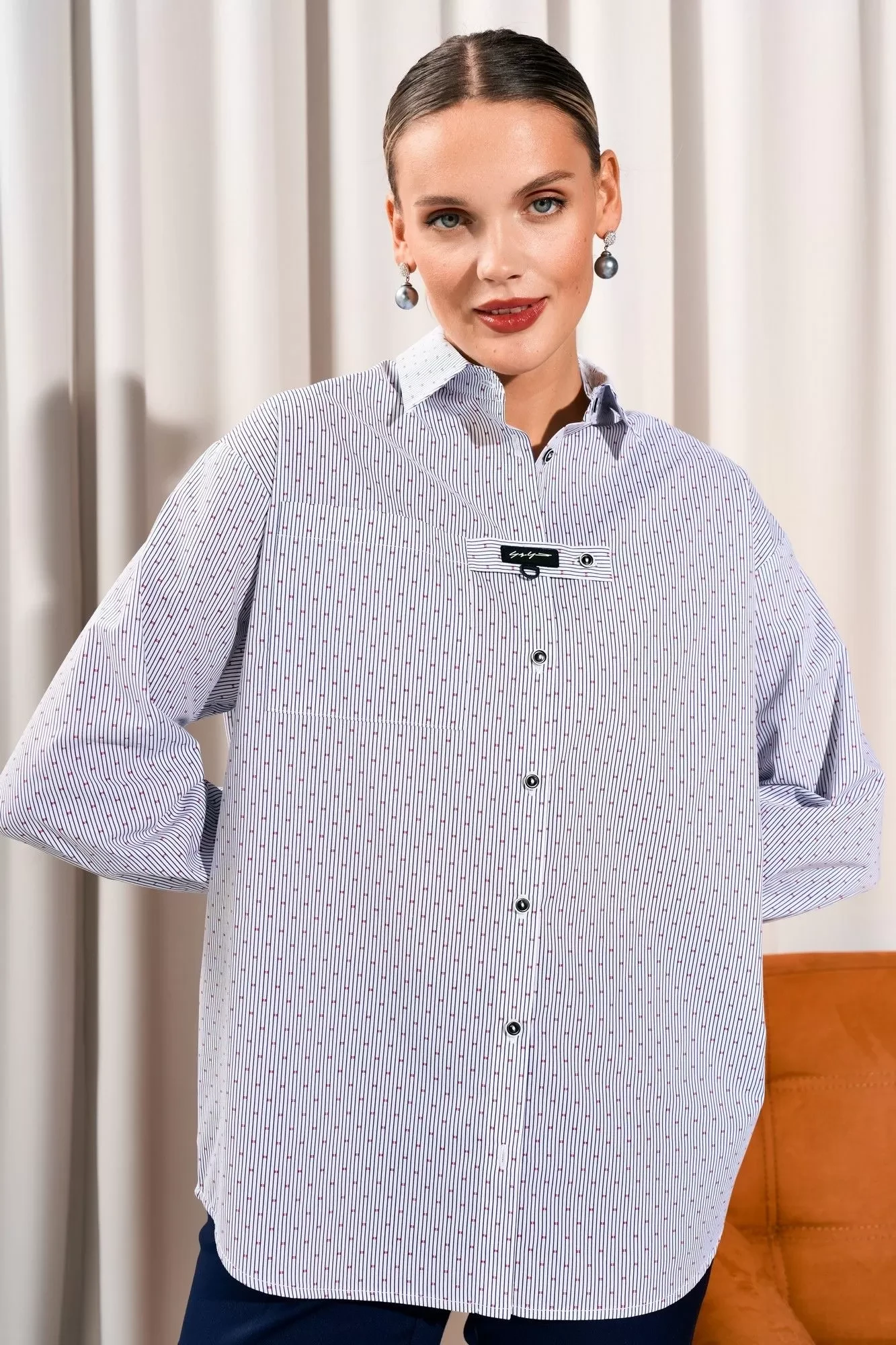 Блуза -рубашка со стояче отложным воротником и центральной застёжкой на петли и пуговицы. Перед с накладным карманом и декоративной деталью с застёжкой на пуговицу. Спинка с отрезной кокеткой и складкой от неё. Рукава втачные с манжетами по низу.