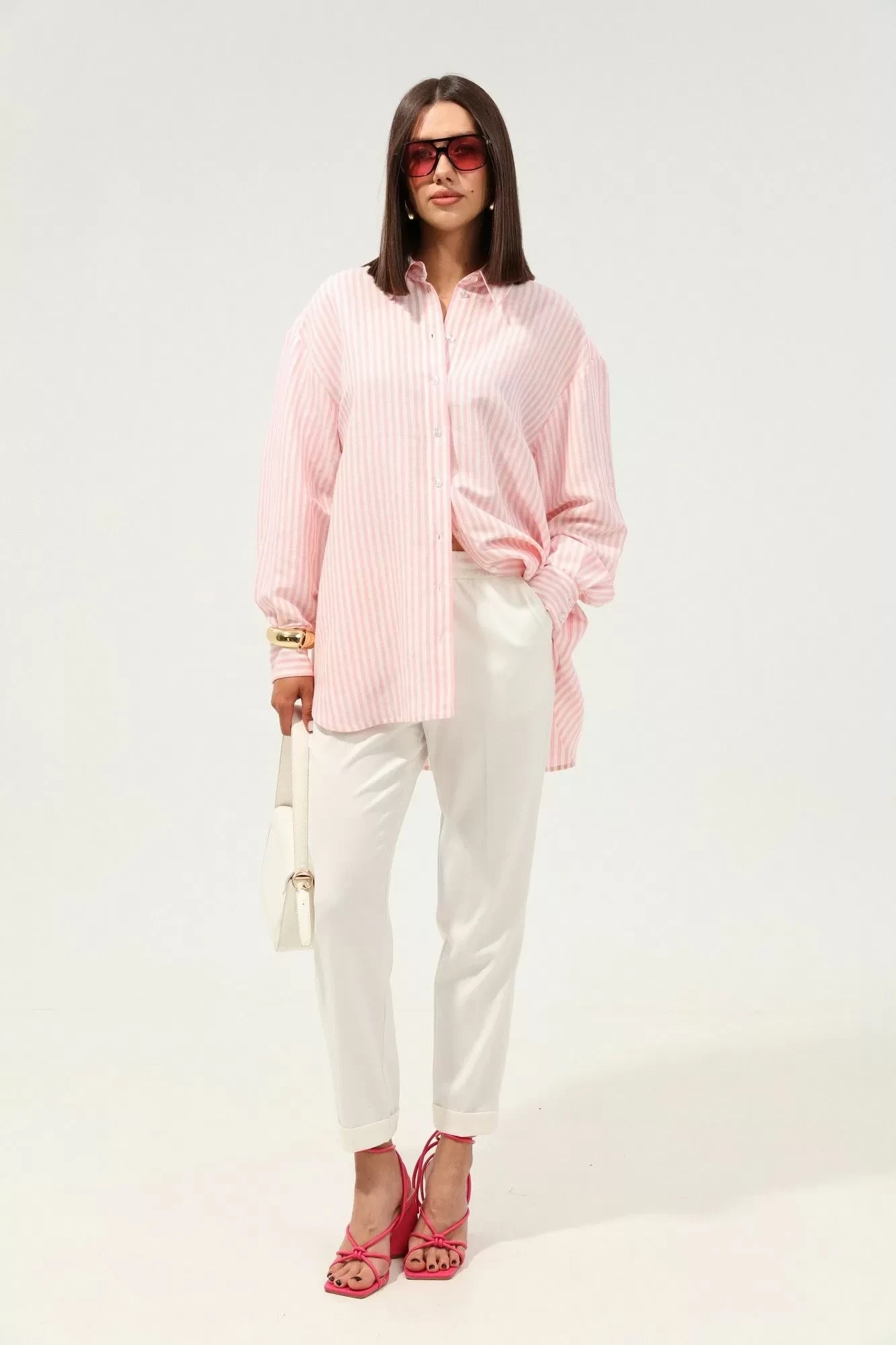 Рубашка большого объема, прямого силуэта. На детали спинки расположена двойная кокетка, переходящая на деталь полочки. Под кокеткой на спинке встречная складка. Воротник рубашечный отложной на стойке. Застежка планка центральная на прорезные петли и пуговицы. Линия плеча спущенная, рукав рубашечный, длинный. В нижней части рукава заложены складки, заканчивается манжетой с двумя прорезными петлями и пуговицами. Низ блузки разноуровневый: спереди короче, сзади длиннее.
