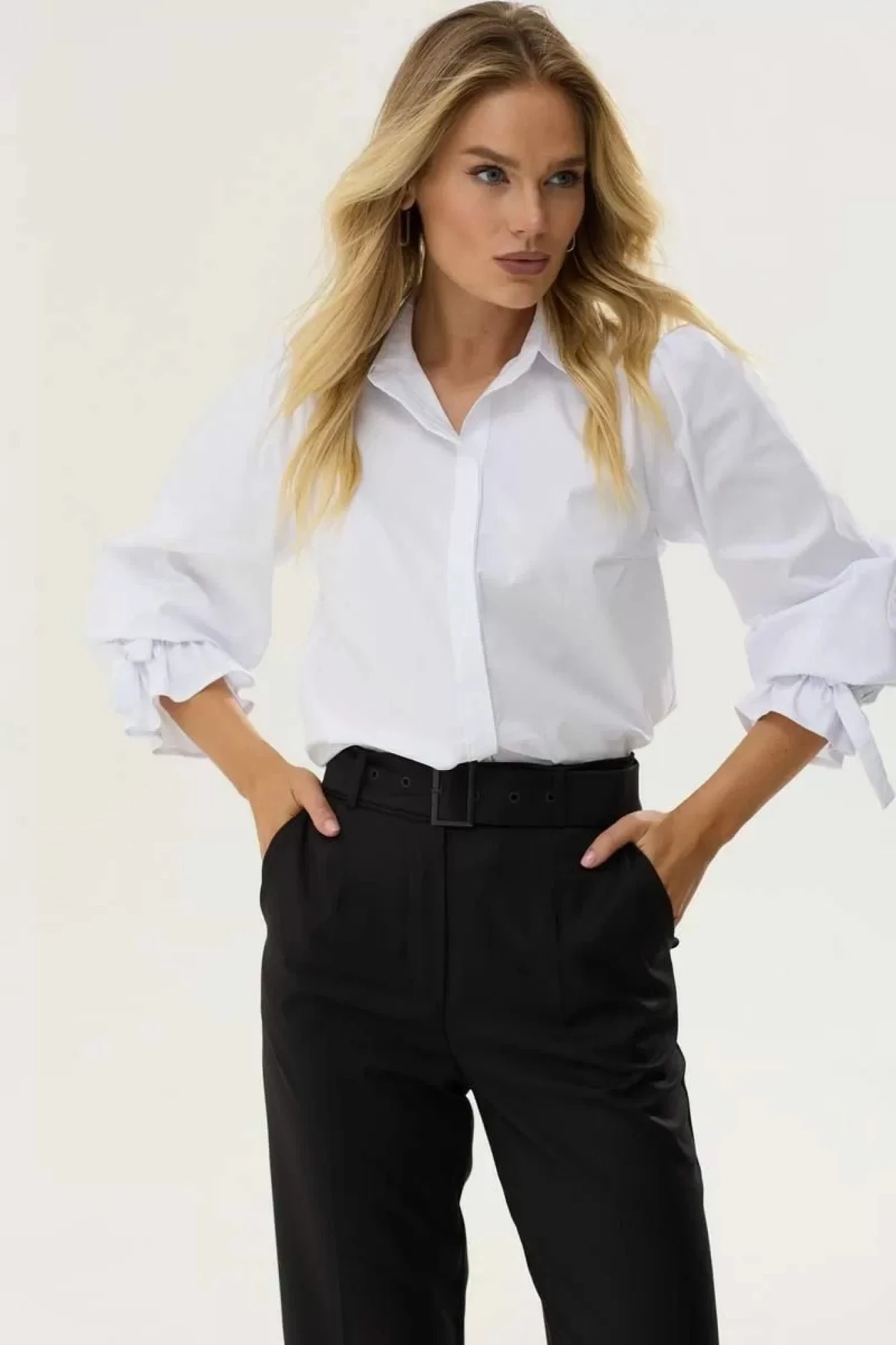 Блузка из хлопчатобумажной ткани прямого силуэта. Воротник рубашечного типа на притачной стойке. Перед блузки с нагрудными вытачками и потайной центральной застежкой на петли и пуговицы. Рукав втачной длинный, расширенный книзу, со сборкой по окату, с декоративной завязкой в области запястья. Рост модели 178 см
