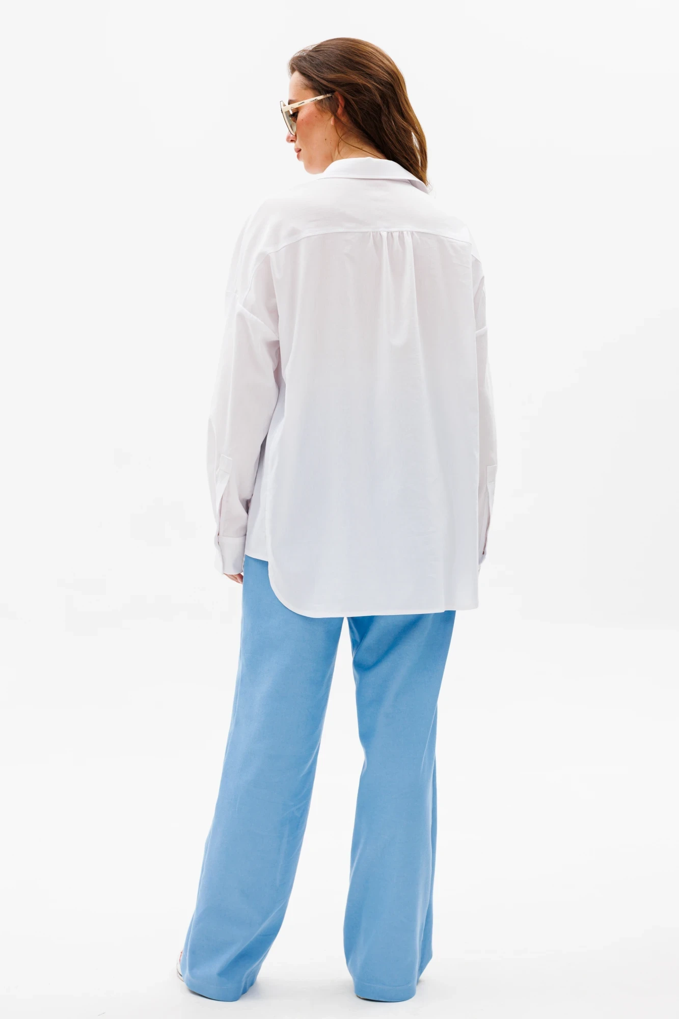 Рубашка прямого кроя объёма оверсайз со спущенной линией плеча с асимметричным бочком. Горловина обработана рубашечным воротником с отрезной стойкой. Застёжка центральная на петли и пуговицы. Есть нагрудный карман. Низ рукава обработан притачной манжетой, застёгивается на пуговицы. В комплект к изделию идёт съемная декоративная нашивка.