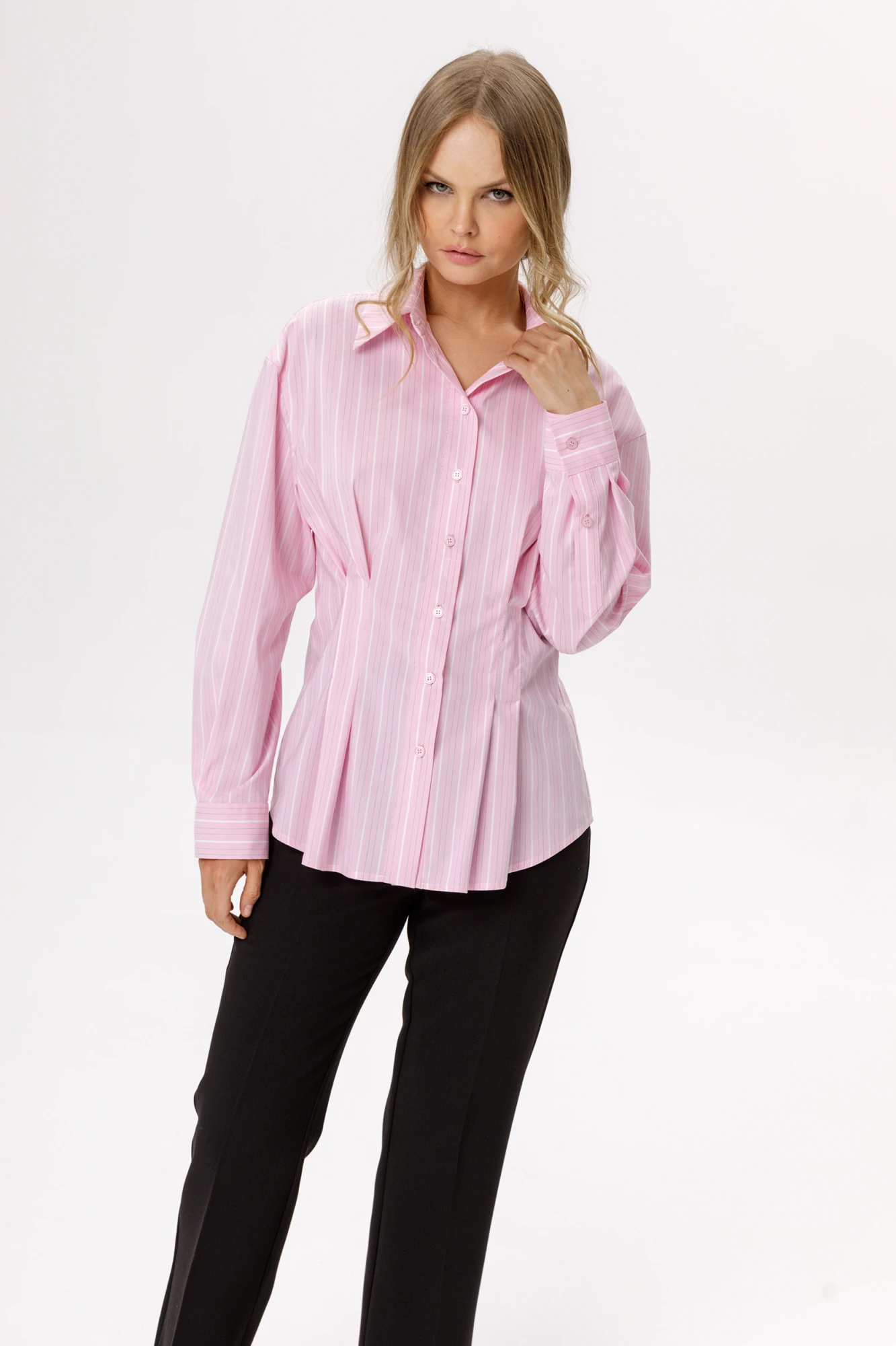 Приталенная рубашка в полоску из хлопка со складками по талии (приобрести брюки с фото можно по арт. 6557).
