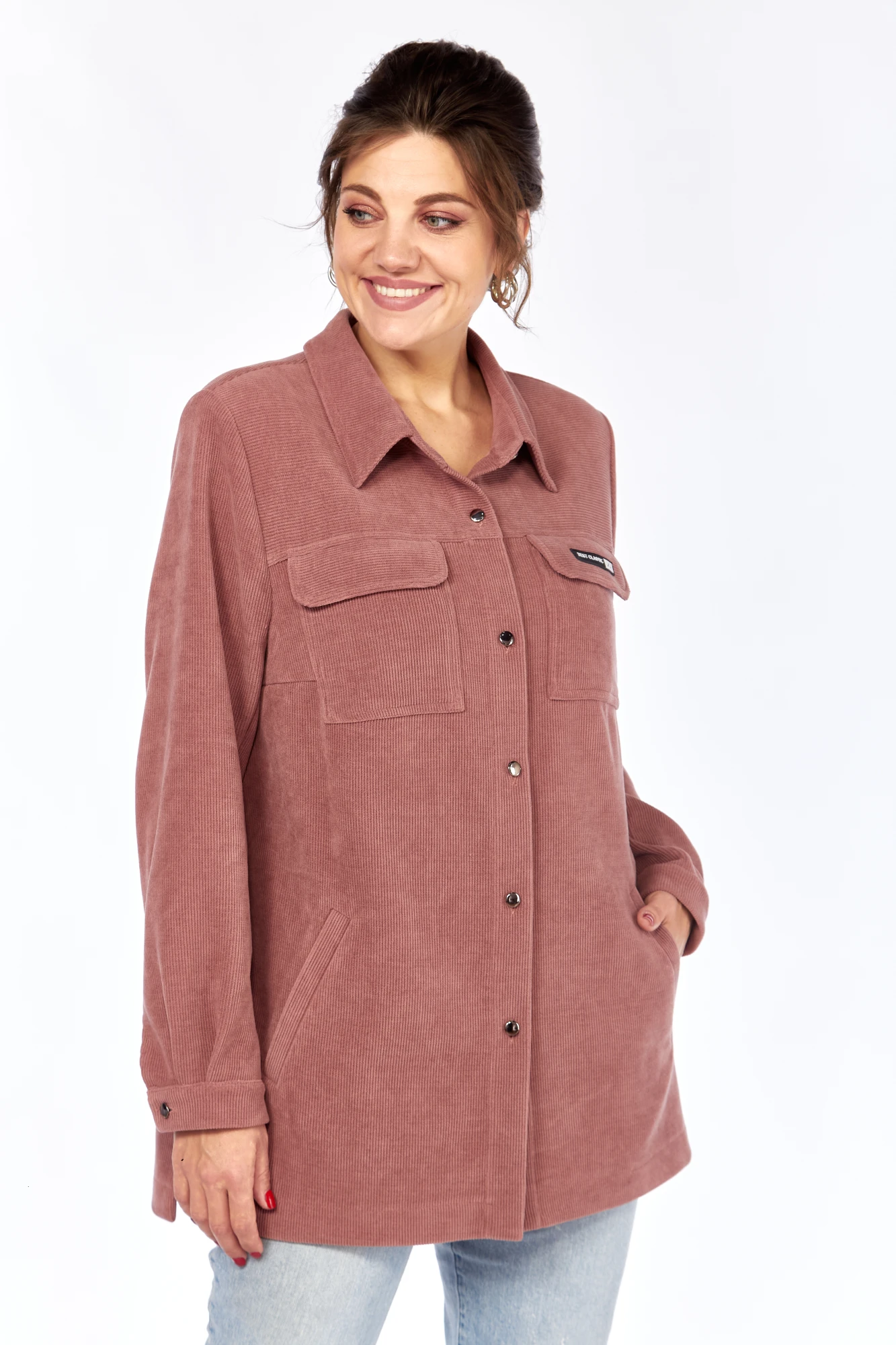 Рубашка прямого кроя с застёжкой-планкой на шесть петель и пуговиц. На переде обработаны нагрудные вытачки, кокетки, накладные карманы с клапанами, прорезные карманы с листочками. Спинка с кокеткой, складкой и отделочной шлёвкой по центру. Рукав втачной, длинный, по низу застёгивается манжетой с пуговицей. Воротник стояче-отложной с отрезной стойкой. В боковых швах разрезы, низ рубашки разноуровневый. Материал хорошо тянется(трикотажная основа) и держит тепло, поэтому жакет комфортно носить в прохладную погоду.