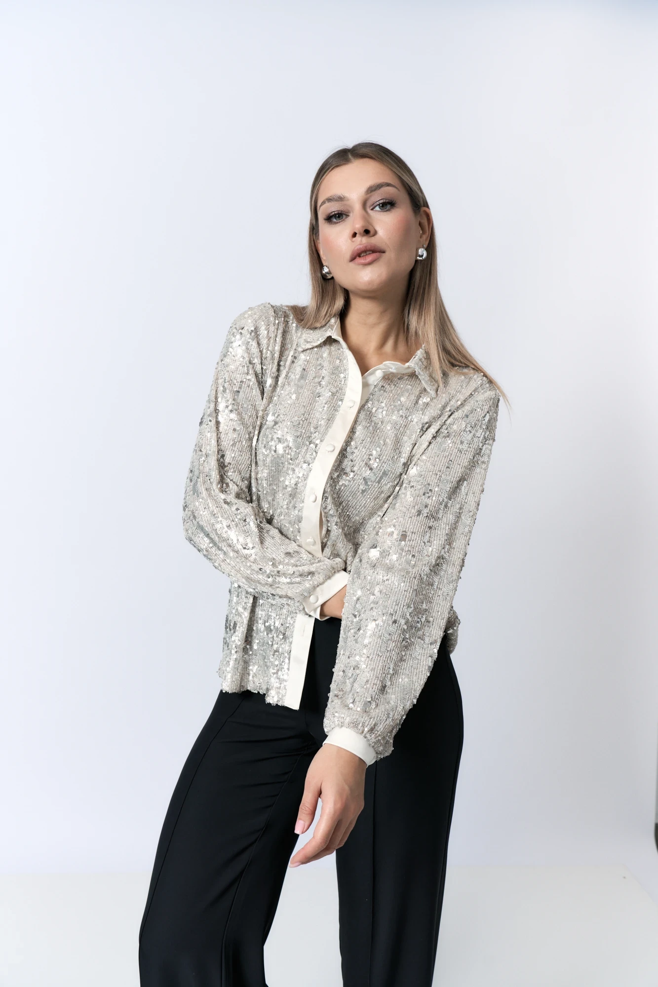 Рубашка прямого силуэта. Воротник на стойке. Рукав втачной, на манжете. Застегивается на петлю-пуговицу. По переду планка из отделочной ткани, которая застегивается на петли-пуговицы.