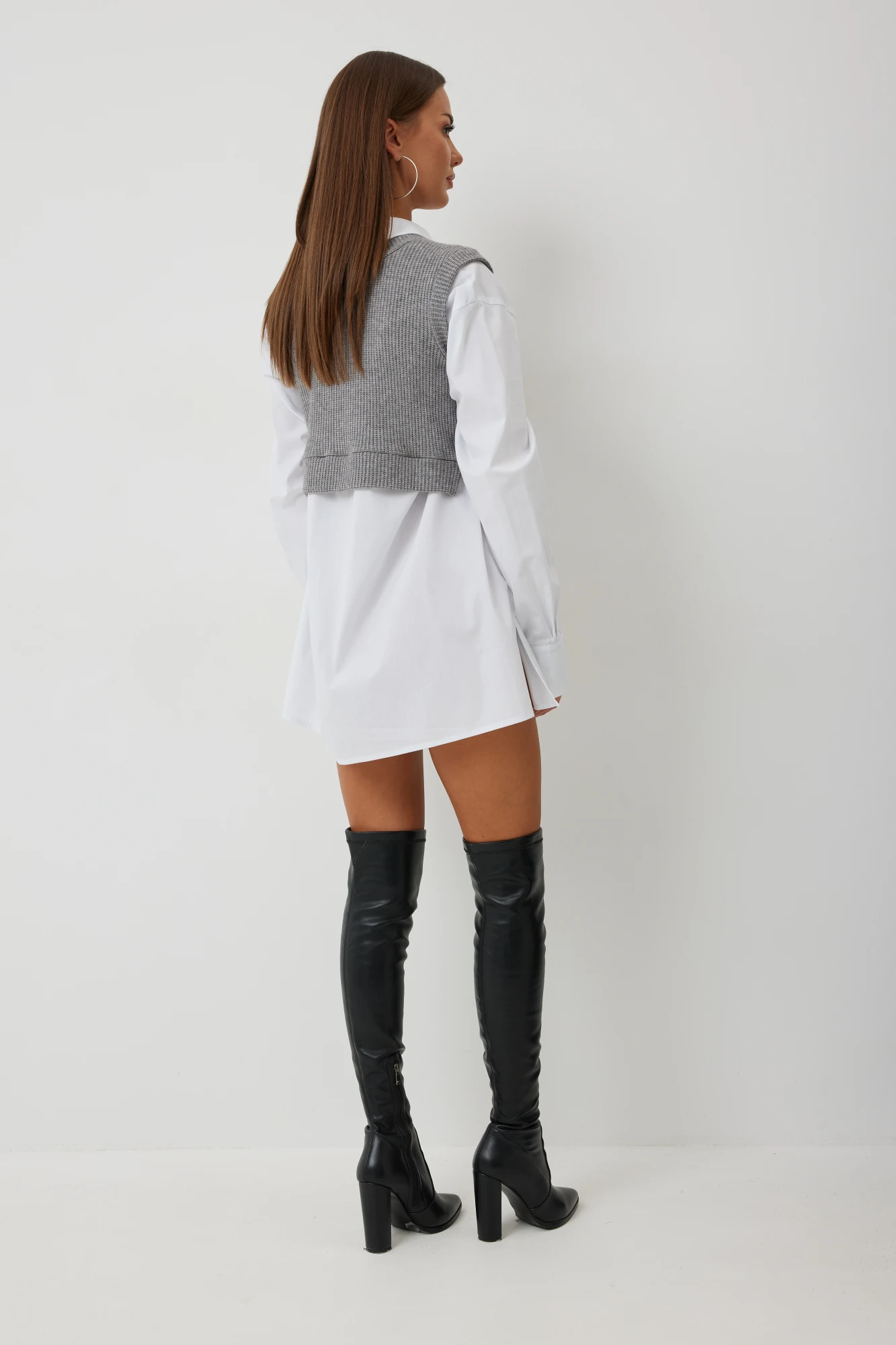 жилет: вязка - 50% вискоза, 25% полиэстер, 25% нейлон рубашка: 65% хлопок, 32% вискоза, 3% спандекс
