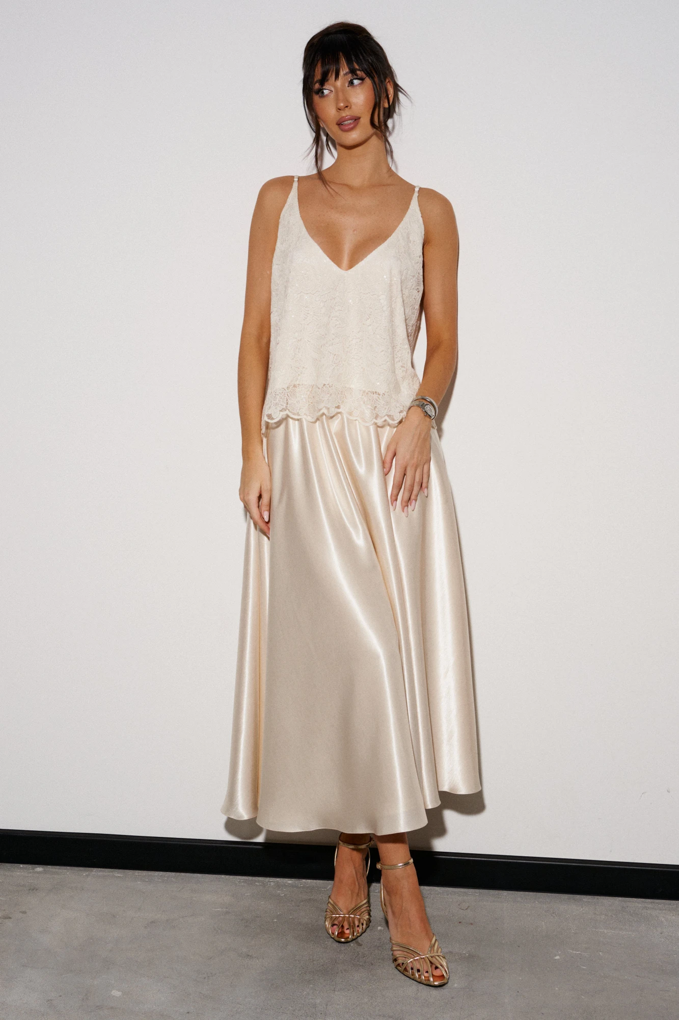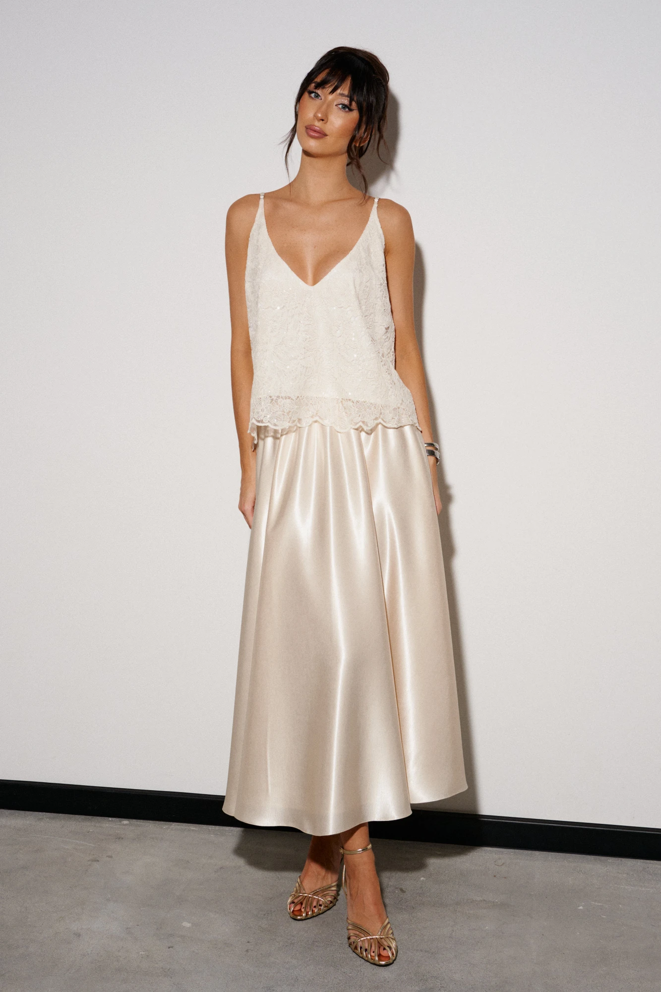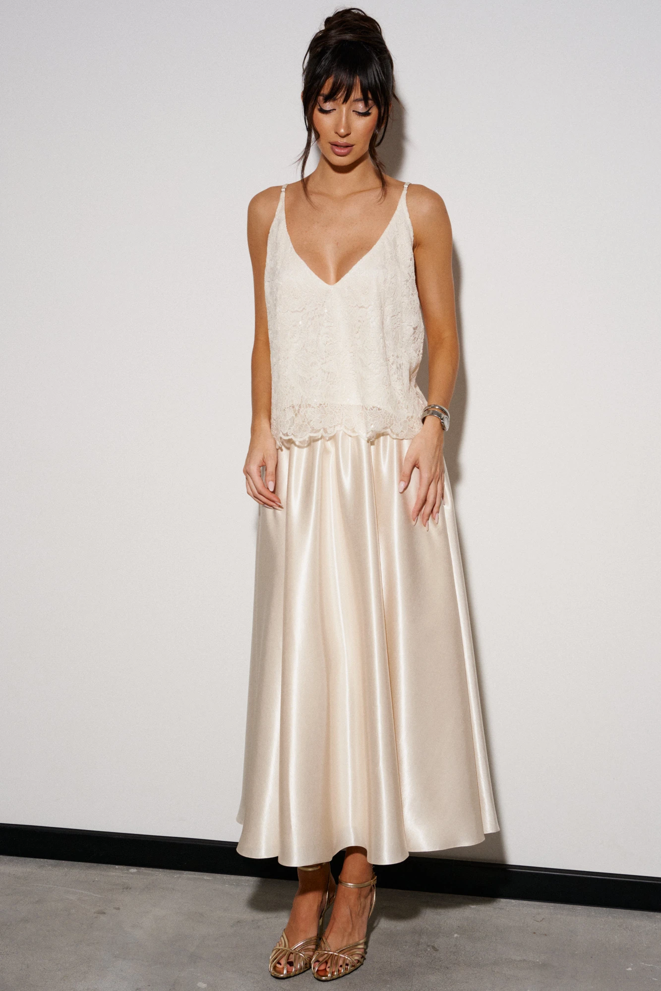 Топ прямого свободного прямого кроя, выполнен из кружевного сатинового полотна молочного цвета. Характеристика: прямой крой, v-образный вырез горловины. Подкладка, тонкие бретели с регулировкой. Длина по спинке 40 см