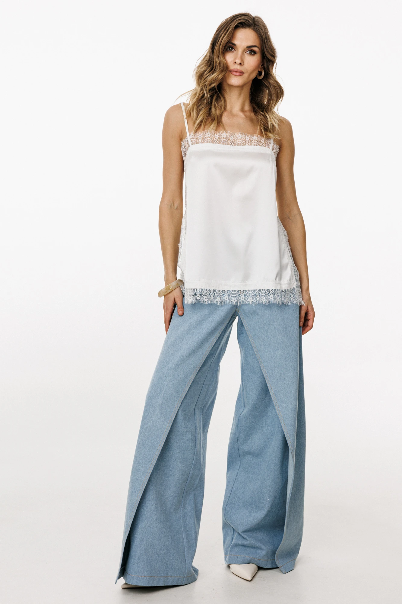 Топ выполнен из тонкого атласа. Топ прямого силуэта длиной выше линии бедер. По переду обработаны нагрудные вытачки. Топ на регулируемых бретелях из основной ткани. В боковых швах обработаны разрезы. Топ декорирован тесьмой-кружевом по горловинам переда и спинки, по боковым и по низу.