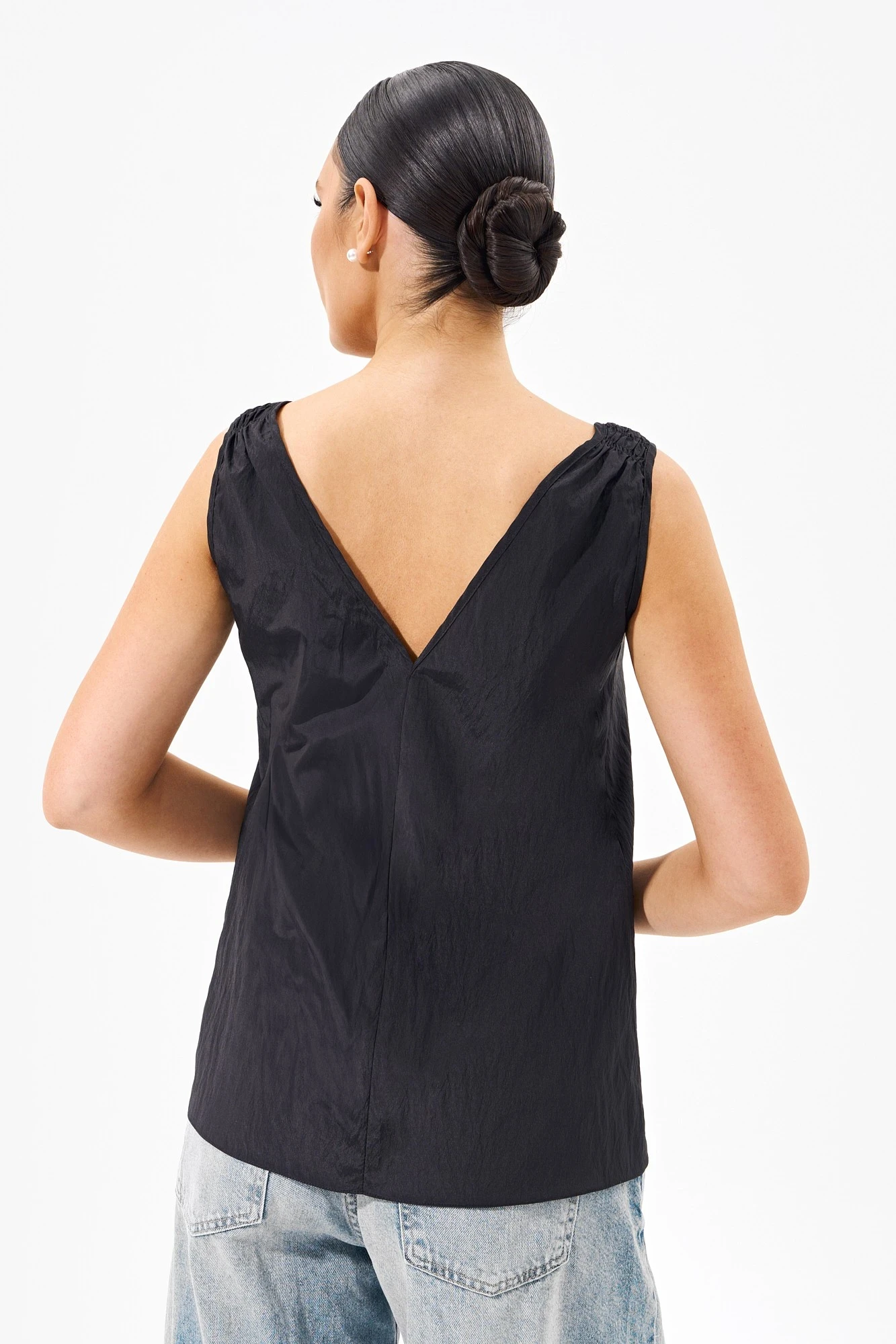 Базовый женский топ свободного силуэта с фигурными линиями по переду и небольшой сборкой по бретелям.