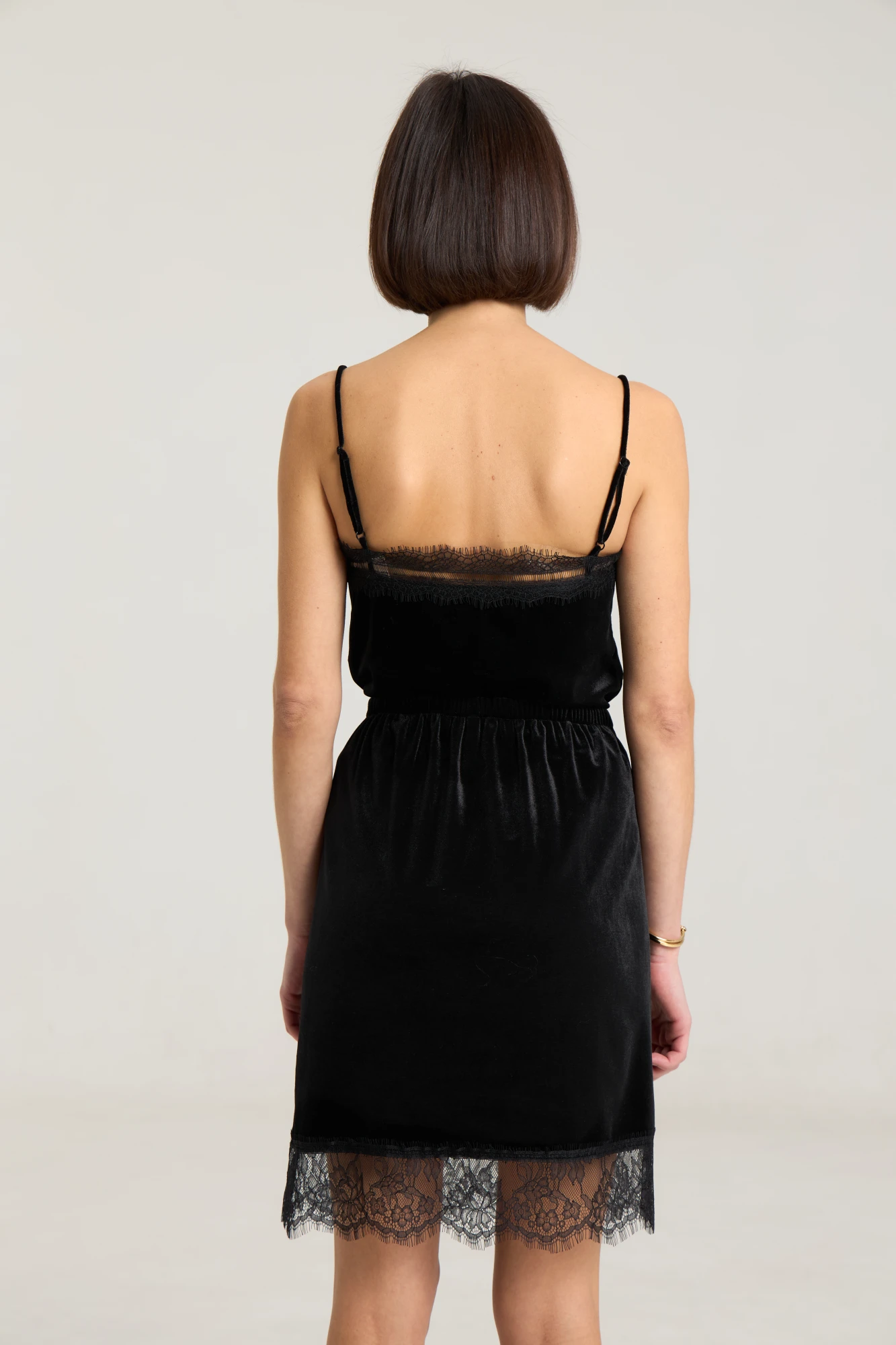 Топ выполнен из мягкой велюровой ткани, на регулируемых бретелях. Полуприлегающего силуэта, по переду и спинке отстрочено кружевом. Длина -40см с кружевом, полуобхват груди 40 см в 42-м размере.