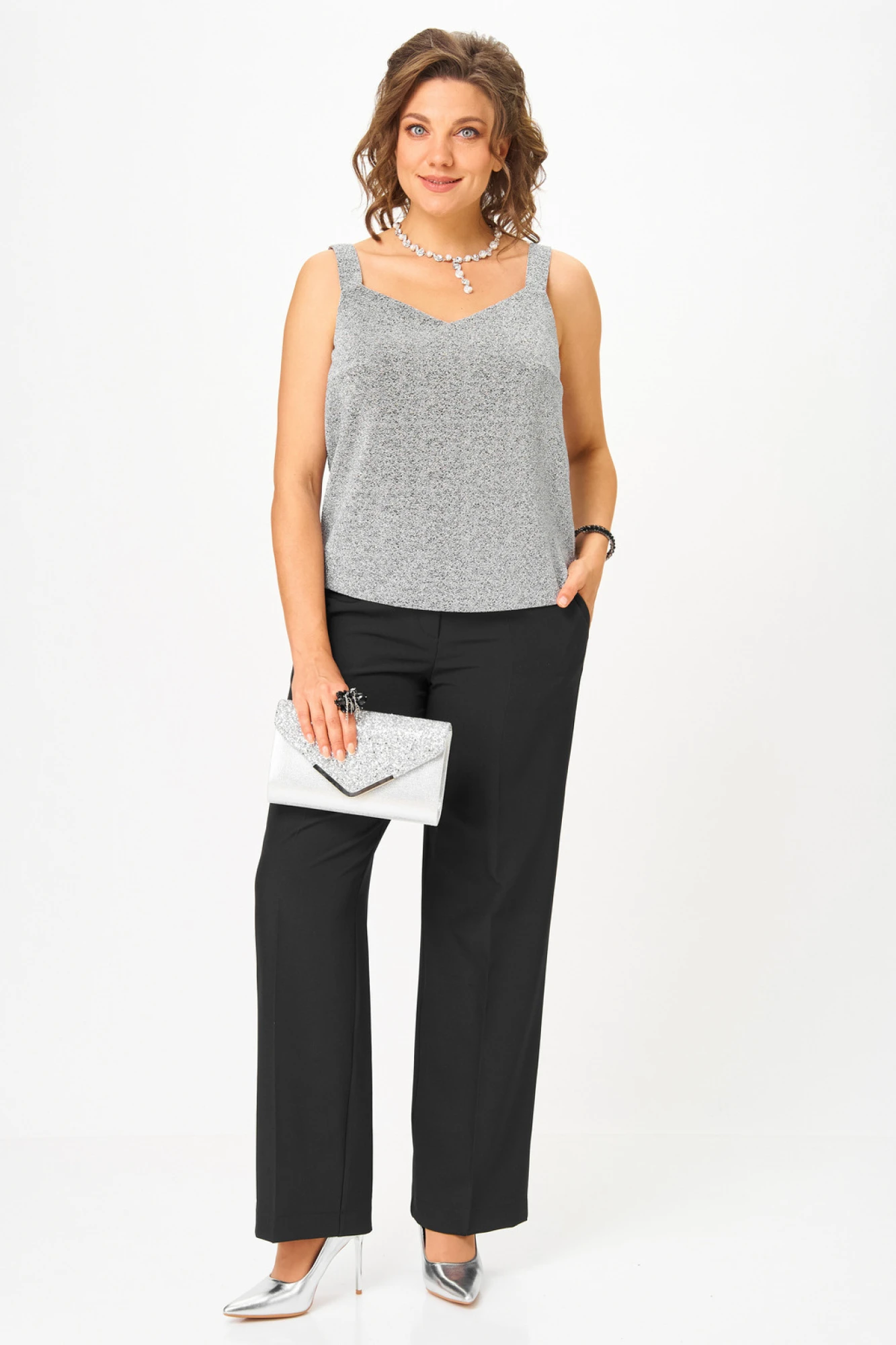 Топ прямого силуэта на широких бретелях, выполнен из трикотажного полотна с люрексом. Перед с нагрудными вытачками. Горловина переда лёгкой V-образной формы. Спинка цельнокроеная.