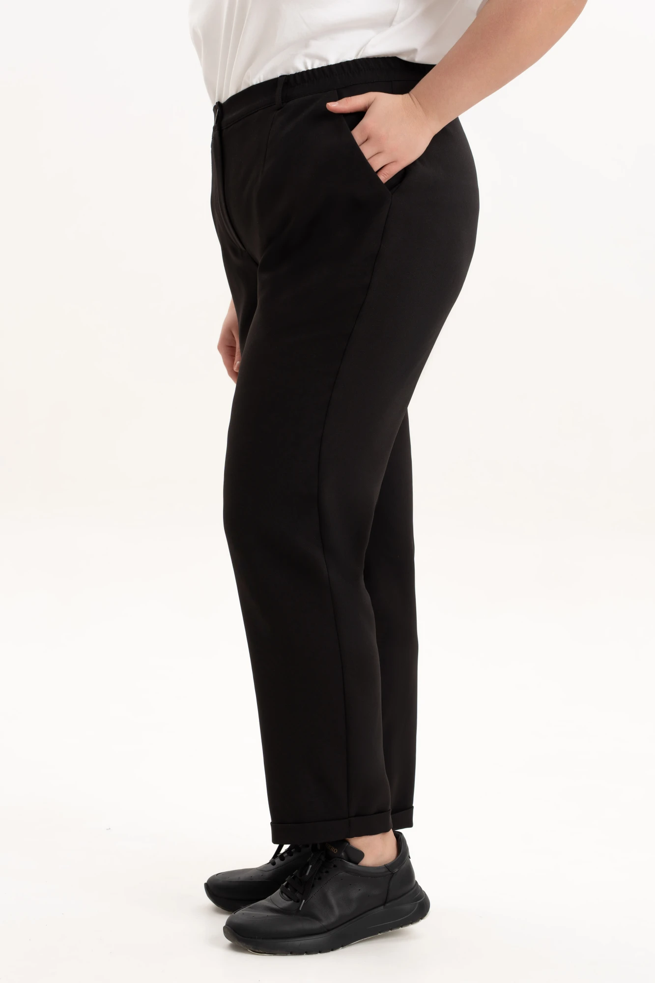Брюки женские на резинке подчеркнут женственность и элегантность фигуры и станут незаменимым элементом базового гардероба. Брюки зауженные к низу, выполнены из качественной, приятной на ощупь костюмной классической ткани, которая не деформируется после стирки, не вытягивается и не скатывается при активном образе жизни. Брюки с высокой посадкой и эластичной резинкой на поясе обеспечат Вам идеальный силуэт, подчеркнут все достоинства фигуры и создадут максимальный комфорт в движении. Зауженные к низу штанины красиво оформлены и за счет удачного фасона невероятно стройнят. Женские брюки представлены в больших размерах - плюс сайз. Благодаря своему крою и выверенному лекалу подойдут как стройным так и полным женщинам. Брюки идеальны для создания строгих офисных луков и стильных повседневных, а также праздничных вечерних образов идеальны для работы, учебы, прогулок и мероприятий.. Данная модель выгодно подчеркнет Ваши достоинства, помогут создать офисный, нарядный, вечерний и повседневный образ в стиле кэжуал. Однотонный черный цвет этих брюк гармонично сочетаться с любым верхом. Прекрасный вариант на осень, зиму и весну. Высокая посадка брюк удлияет ноги и стройнит. Подходят полным девушкам и для стиля оверсайз. По низу брюк обработаны манжеты. Пояс частично на резинке, застежка на молнию и петлю с пуговицей.