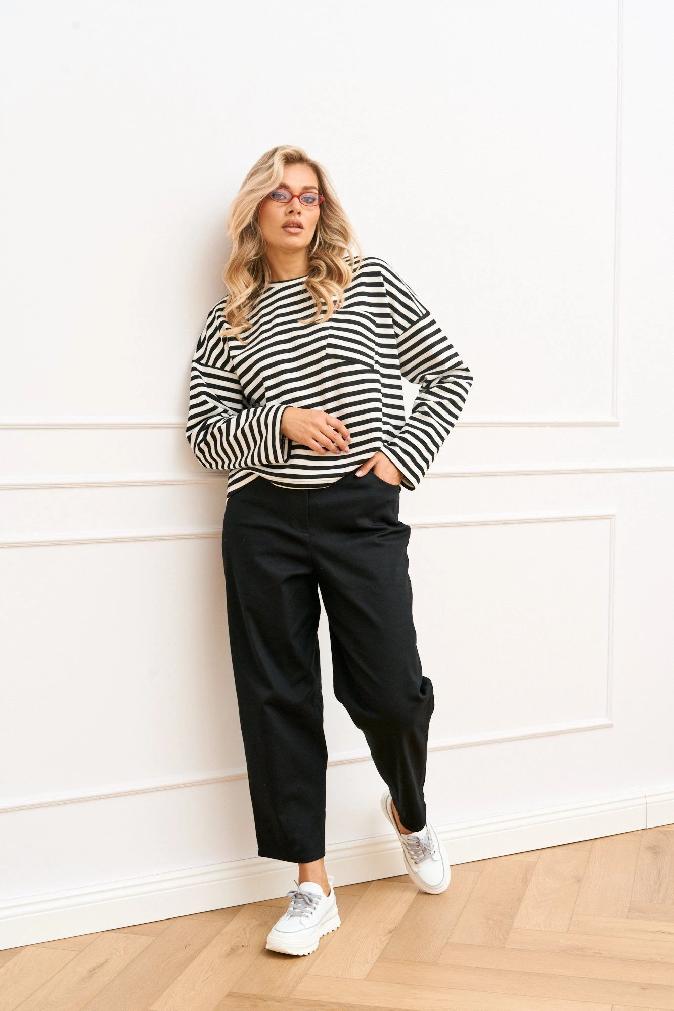 Модный вариант брюки-джинсы slouchy (слоучи) их еще называют джинсы-бананы выполнены из качественного и комфортного в носке джинса. Джинсы застегиваются на молнию и пуговицу, расположенные на притачном поясе. Оснащены удобными боковыми джинсовыми карманами спереди и накладными карманами сзади, что добавляет практичности. Фигурная кокетка на задней части улучшает посадку и подчеркивает линию талии, делая акцент на силуэте. Эти джинсы прекрасно подойдут как для повседневного, так и для более составленного образа, легко сочетаясь с различными элементами гардероба.