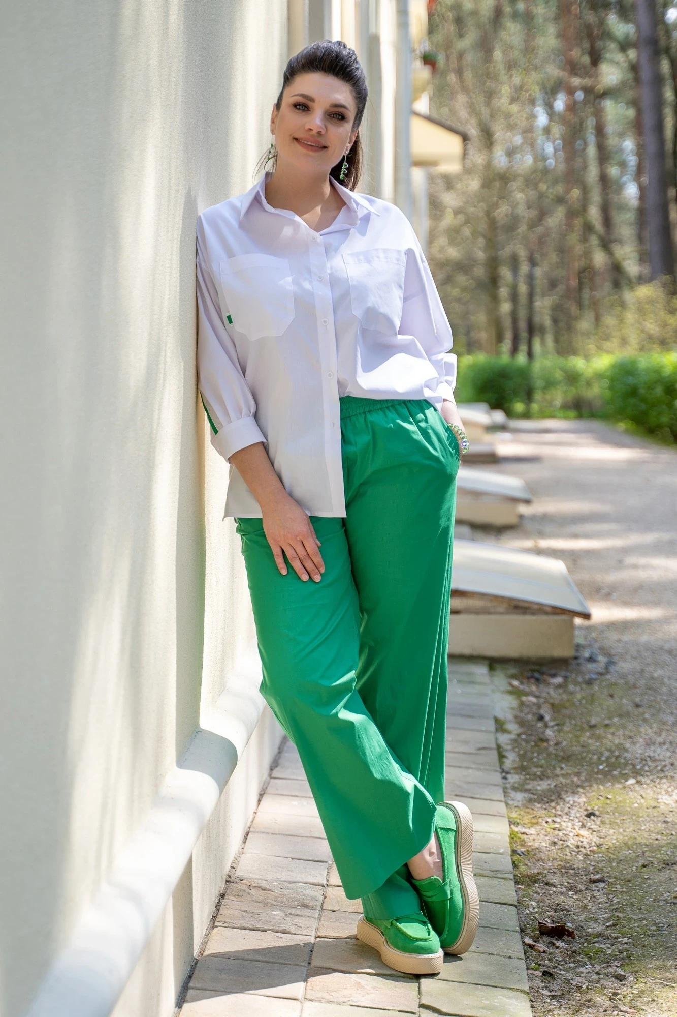 Брюки женские прямого силуэта, на притачном поясе с резинкой. Передние половинки с боковыми карманами. Задние половинки с талевыми вытачками и накладными карманами. На боковом шве по низу декор.