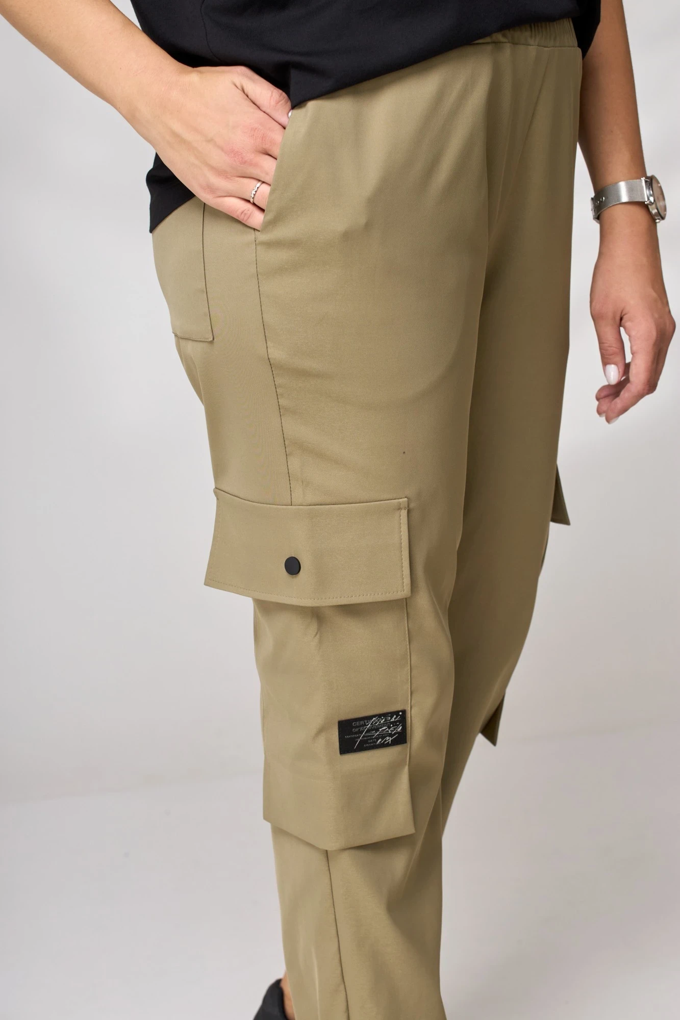 Брюки женские свободные, на притачном поясе с эластичной тесьмой. Передние половинки с двумя наклонными карманами, по боковым швам расположены накладные карманы с клапанами на кнопках. Низ брюк сзади с эластичной тесьмой.
