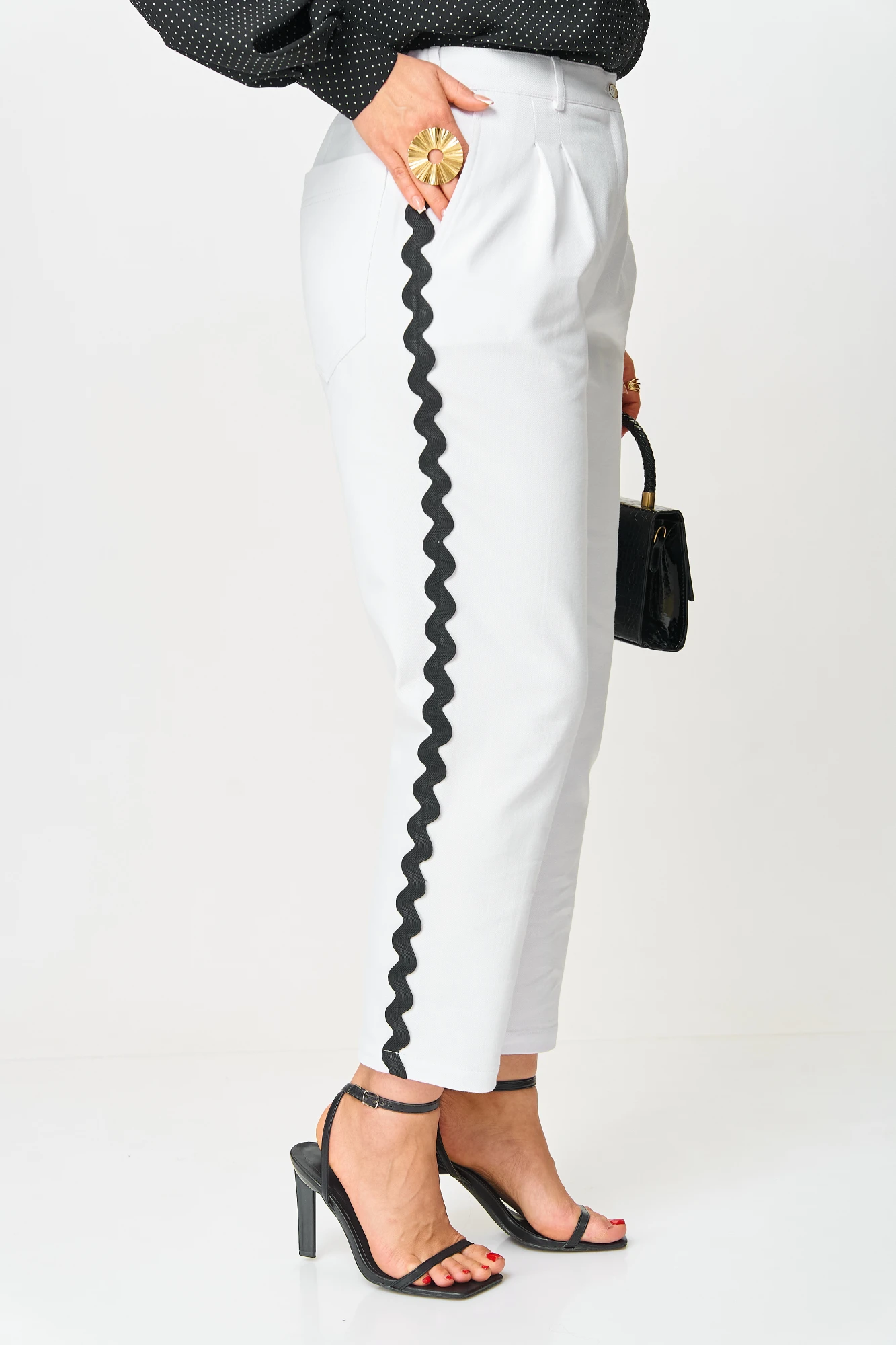 Джинсы мом с высокой посадкой - это идеальный выбор для женщин, ищущих комфорт и стиль в повседневной жизни, на работе. Брюки изготовлены из высококачественного смесового хлопка, обеспечивают идеальный баланс между удобством и прочностью. Модель с высокой посадкой, с накладными карманами сзади и боковыми наклонными спереди, с декоративной тесьмой по боковым швам. Брюки на притачном поясе частично с резинкой.