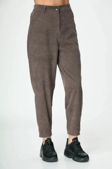 Зауженные книзу за счёт вытачек по передним и задним частям. На передних частях брюк обработаны карманы с отрезным бочком.