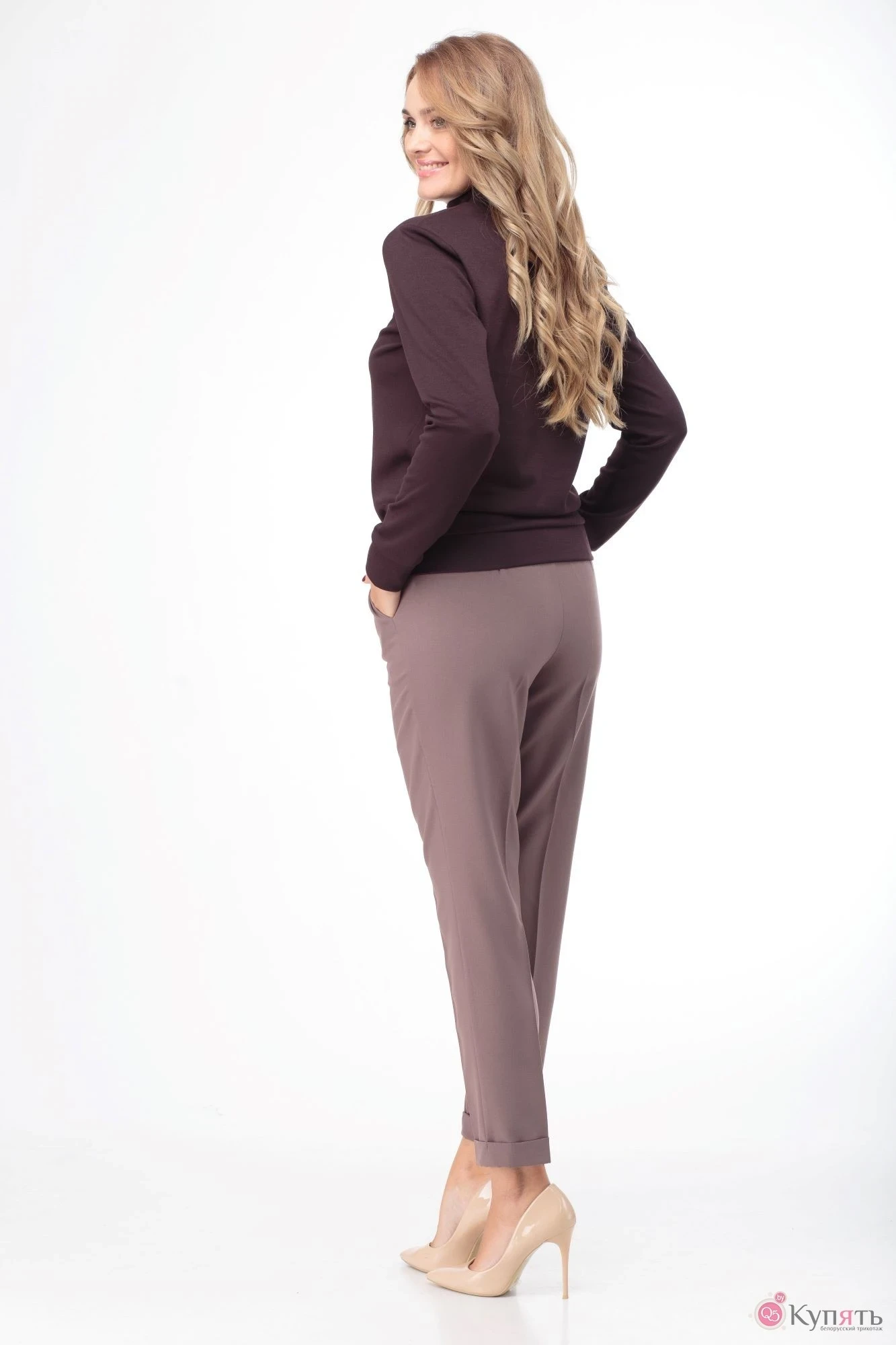 Брюки классического покроя с высокой посадкой, с боковыми карманами, притачным поясом, низ брюк с отворотами.