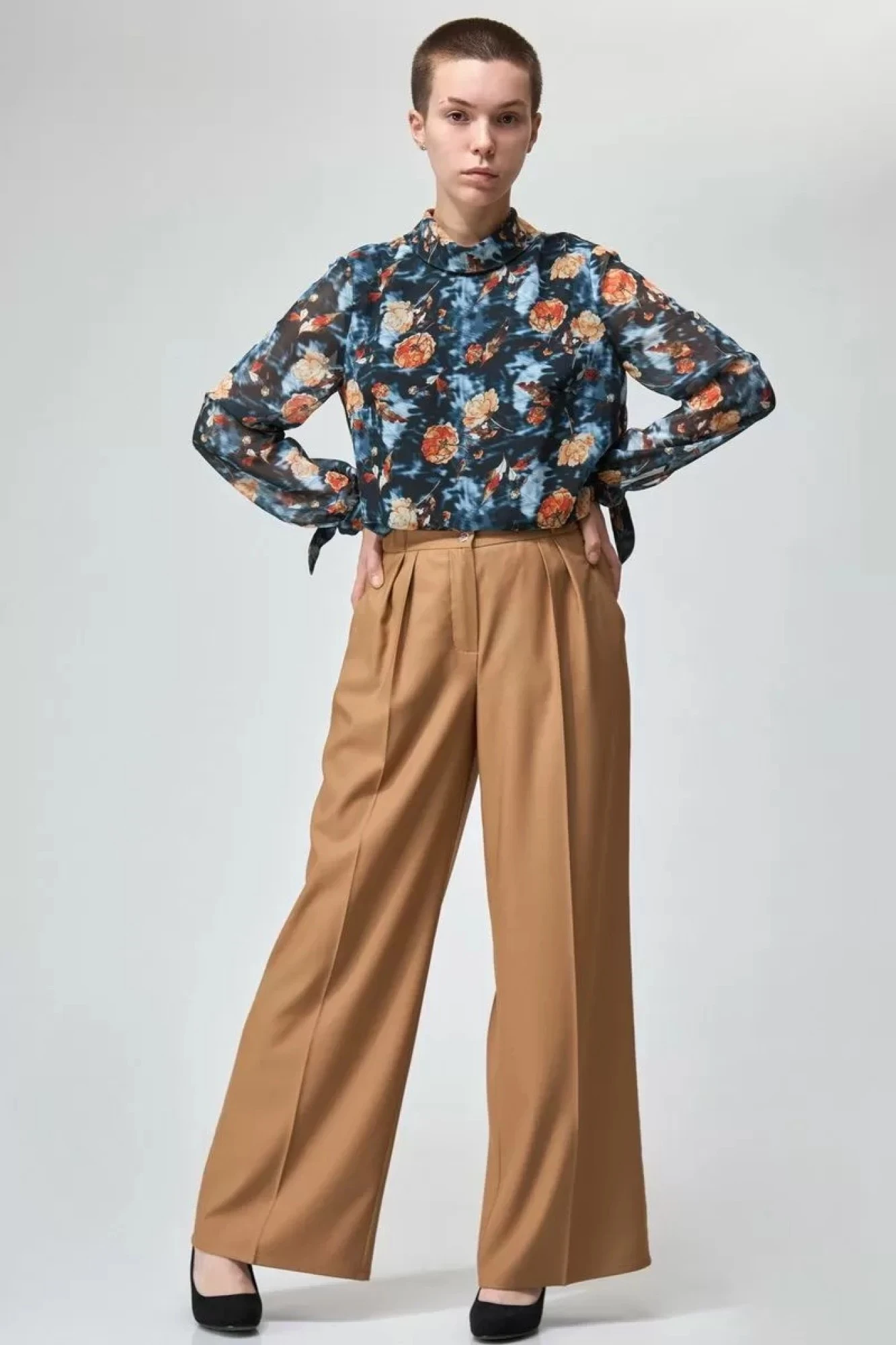 Брюки широкие длинные, с заутюженными стрелками, с высокой посадкой. На передних половинках складки. Пояс притачной с застежкой на молнию, петли и пуговицы, со вставками эластичной тесьмы по бокам. В боковых швах расположены карманы с косым входом.